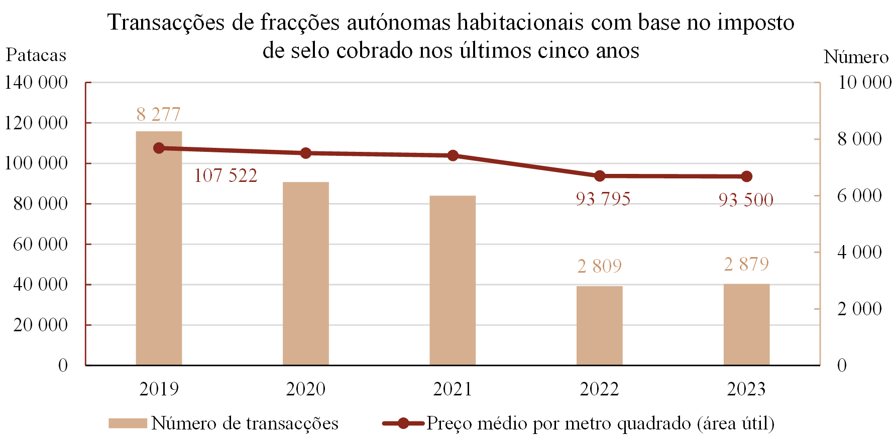 Durante o ano de 2023 transaccionaram-se, com base no imposto de selo cobrado, 4.416 fracções autónomas e lugares de estacionamento pelo valor de 23,23 mil milhões de Patacas, os quais baixaram 2,8% e 5,9%, respectivamente, em termos anuais. Daqueles 2.879 eram fracções autónomas habitacionais (+70, em termos anuais) que foram transaccionadas pelo valor de 18,30 mil milhões de Patacas (+1,8%). Transaccionaram-se 2.722 fracções autónomas habitacionais de edifícios construídos pelo valor de 17,42 mil milhões de Patacas e 157 fracções autónomas habitacionais de edifícios em construção pelo valor de 882 milhões de Patacas. Em comparação com 2019, o número de fracções autónomas habitacionais transaccionadas e o valor diminuíram 65,2% e 64,2%, respectivamente, informam os Serviços de Estatística e Censos.