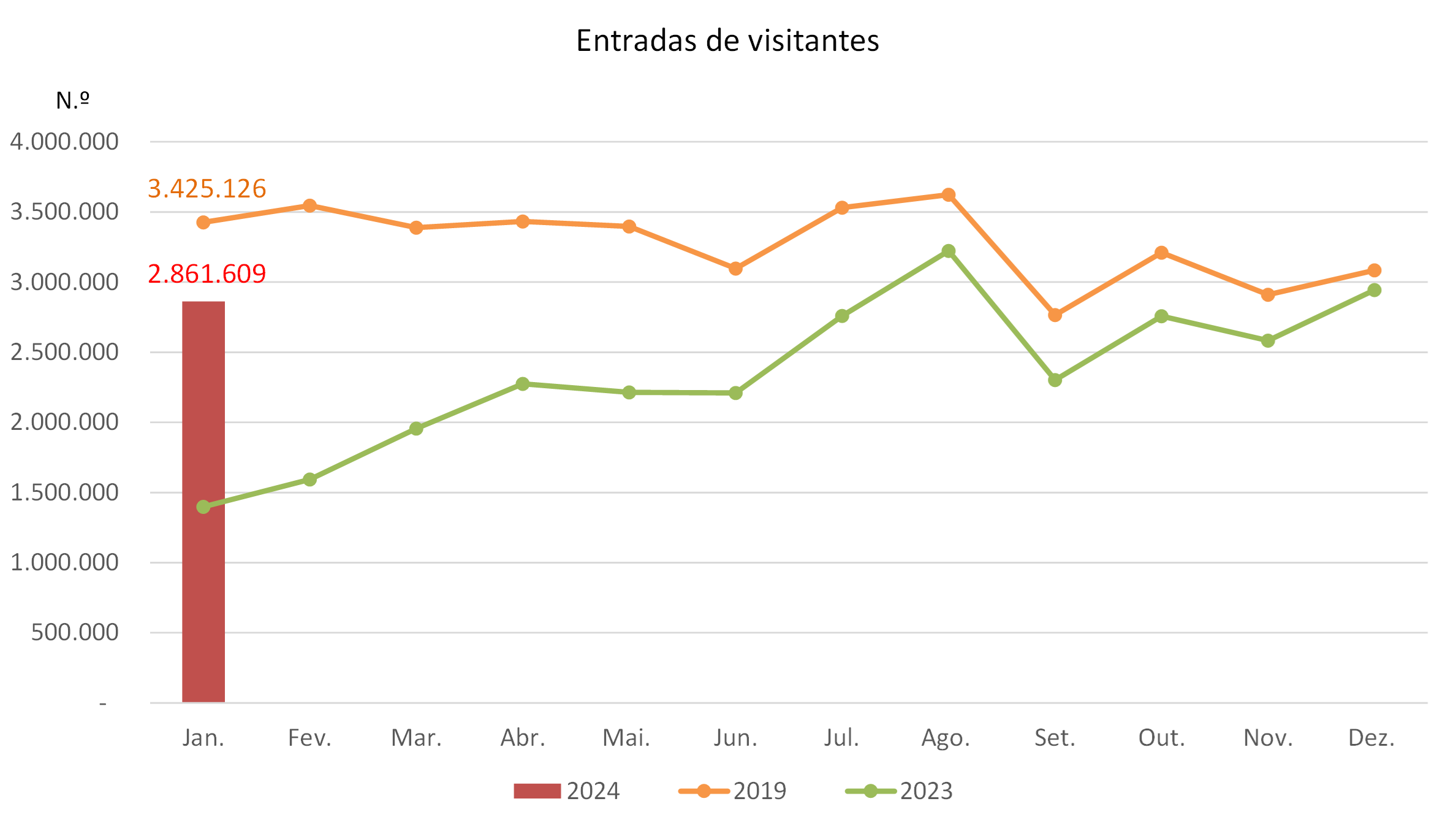 Em Janeiro de 2024 o número de entradas de visitantes em Macau foi de 2.861.609, mais 104,7%, em termos anuais, registando-se uma recuperação de 83,5% do número de entradas de visitantes de Janeiro de 2019, porém, menos 2,8%, face a Dezembro de 2023. Os números de entradas de excursionistas (1.480.098) e de turistas (1.381.511) subiram 154,5% e 69,3%, respectivamente, em relação a Janeiro de 2023. O período médio de permanência dos visitantes correspondeu a 1,2 dias, menos 0,4 dias, em termos anuais. Salienta-se que o período médio de permanência dos turistas (2,2 dias) e o dos excursionistas (0,2 dias) diminuíram 0,4 e 0,1 dias, respectivamente, informam os Serviços de Estatística e Censos.