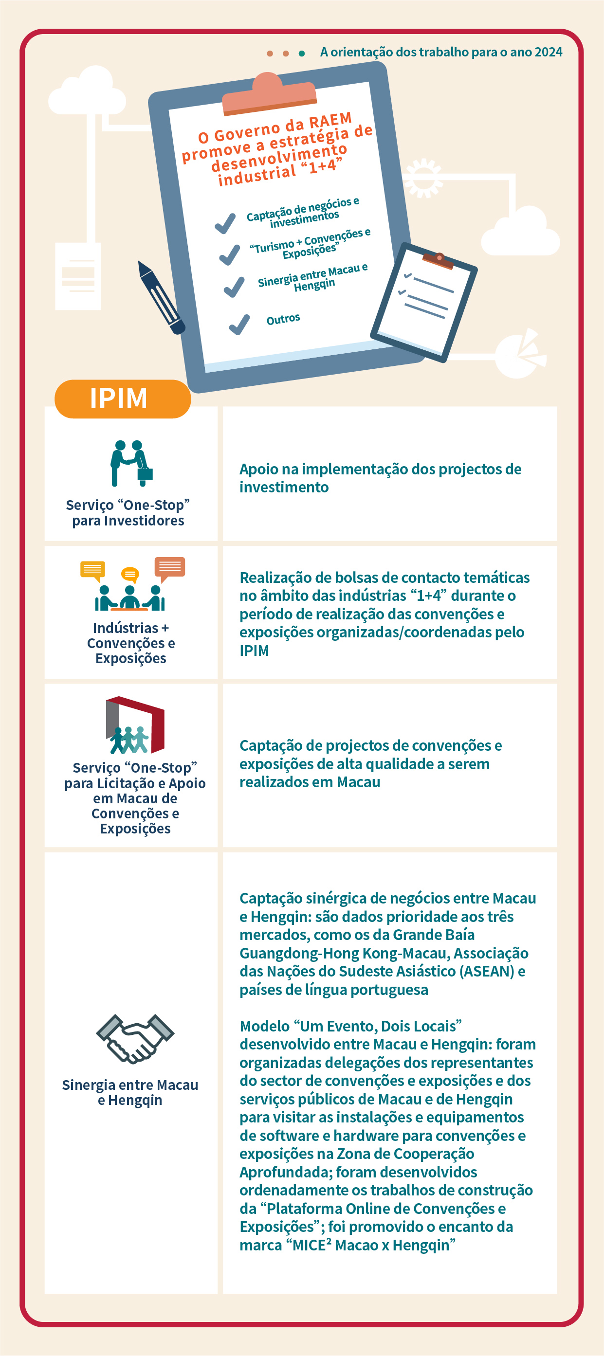Dando continuidade à excelente tendência de recuperação económica registada em 2023, o Governo da Região Administrativa Especial de Macau irá, com base numa série de trabalhos planeados, empenhar-se na promoção da estratégia de desenvolvimento diversificado das indústrias “1+4” em 2024. O conjunto de trabalhos inclui acções de captação de investimentos e negócios, iniciativas no âmbito de “turismo + convenções e exposições” e colaborações entre Macau e Hengqin, e visa introduzir mais projectos de qualidade das indústrias “1+4”, contribuindo, deste modo, para estimular o desenvolvimento dessas indústrias e dar impulso à diversificação adequada da economia.
