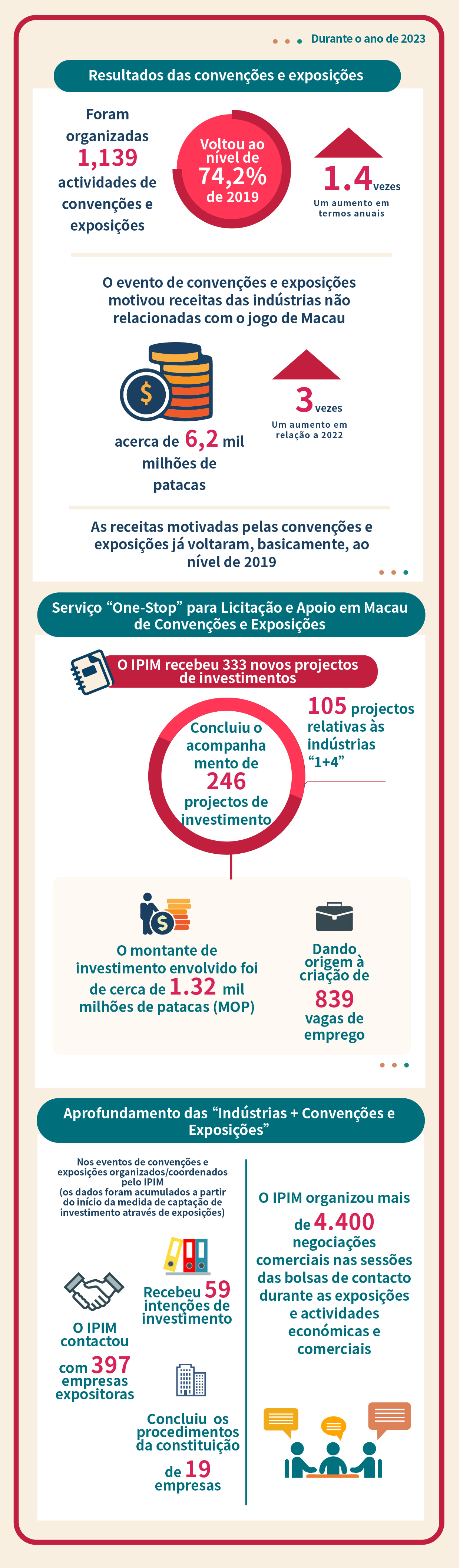 Graças a uma série de medidas de apoio e ao esforço colectivo dos diferentes sectores sociais, o número de actividades de convenção e exposição realizadas em 2023 registou um aumento anual de 1,4 vezes (1.139), recuperando até 74,2% do nível de 2019. Ainda em 2023, a receita das indústrias não jogo de Macau geradas pelas actividades de convenção e exposição atingiu cerca de 6,2 mil milhões de patacas, tendo este montante triplicado face a 2022. Estes resultados mostram que as receitas geradas pelas actividades de convenção e exposição voltaram praticamente aos níveis de 2019.