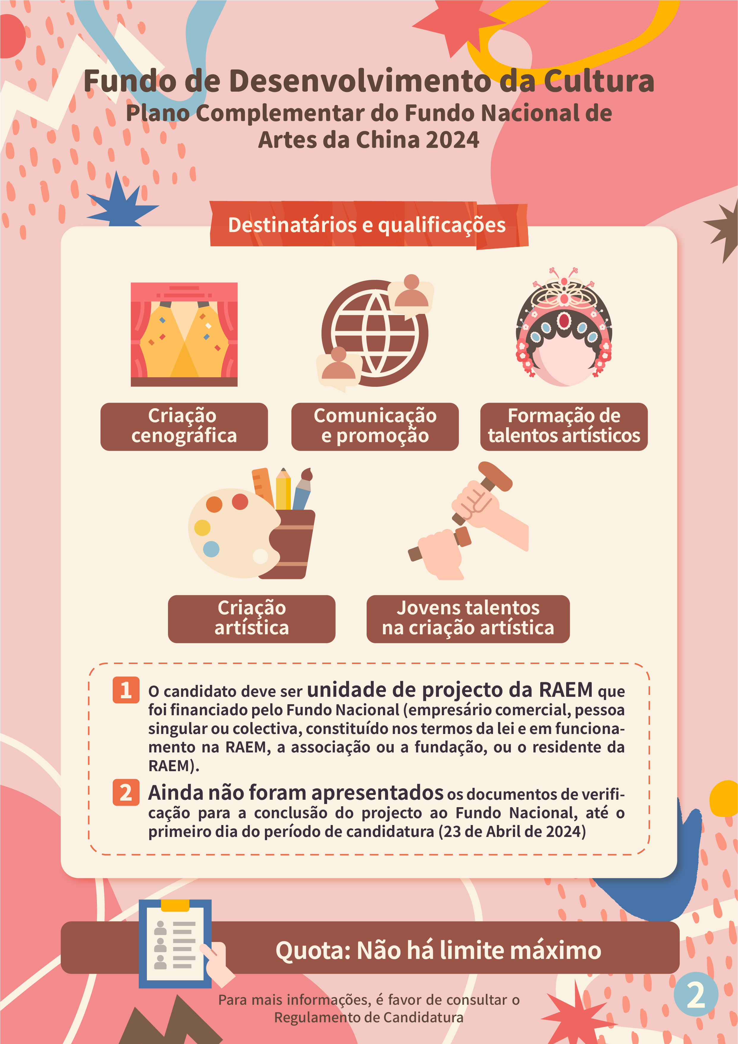 Com vista a apoiar a implementação dos projectos artísticos e culturais de Macau financiados pelo Fundo Nacional de Artes e, incentivar as organizações artísticas e os artistas de Macau a apresentarem activamente candidaturas ao mesmo, o Fundo de Desenvolvimento da Cultura (FDC) continua, no corrente ano, a lançar o “Plano complementar do Fundo Nacional de Artes da China”, com um período de candidatura de 23 de Abril a 11 de Junho.
