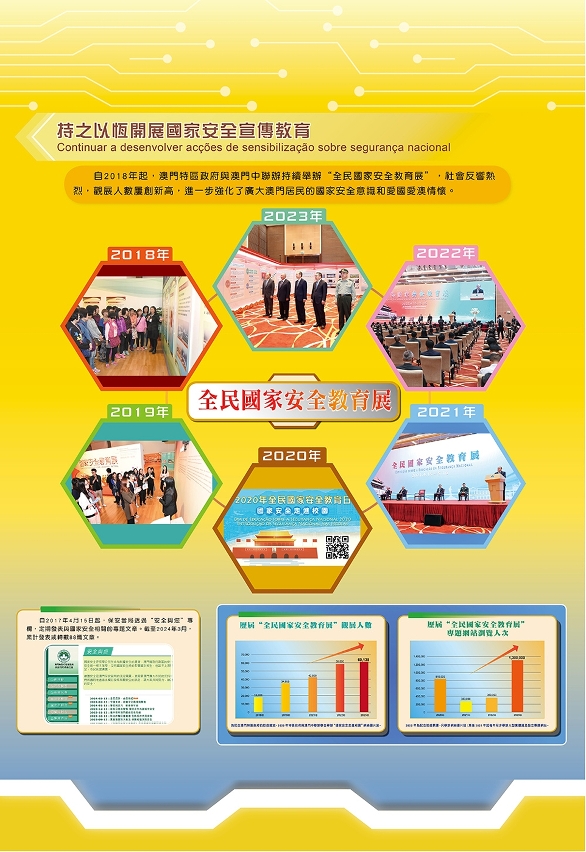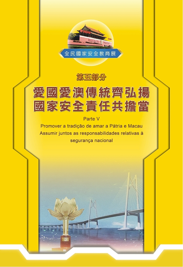 O Governo da Região Administrativa Especial de Macau (RAEM) e o Gabinete de Ligação do Governo Popular Central na RAEM co-organizam, pelo sétimo ano consecutivo, a “Exposição sobre a Educação da Segurança Nacional, inaugurada no 15 de Abril de 2024, em que se assinalou o 9º aniversário do “Dia da Educação da Segurança Nacional” do País. A quinta parte da exposição tem como tema “Promover a tradição de amar a Pátria e Macau Assumir juntos as responsabilidades relativas à segurança nacional”, que se divide em vários capítulos, incluindo “Continuar a desenvolver acções de sensibilização sobre segurança nacional”, “As instituições do Governo Central em Macau e as empresas chinesas realizam actividades educativas de amor pela Pátria” e “Aprofundar a divulgação e educação da segurança do Estado para promover o espírito de patriotismo e de amor por Macau”.