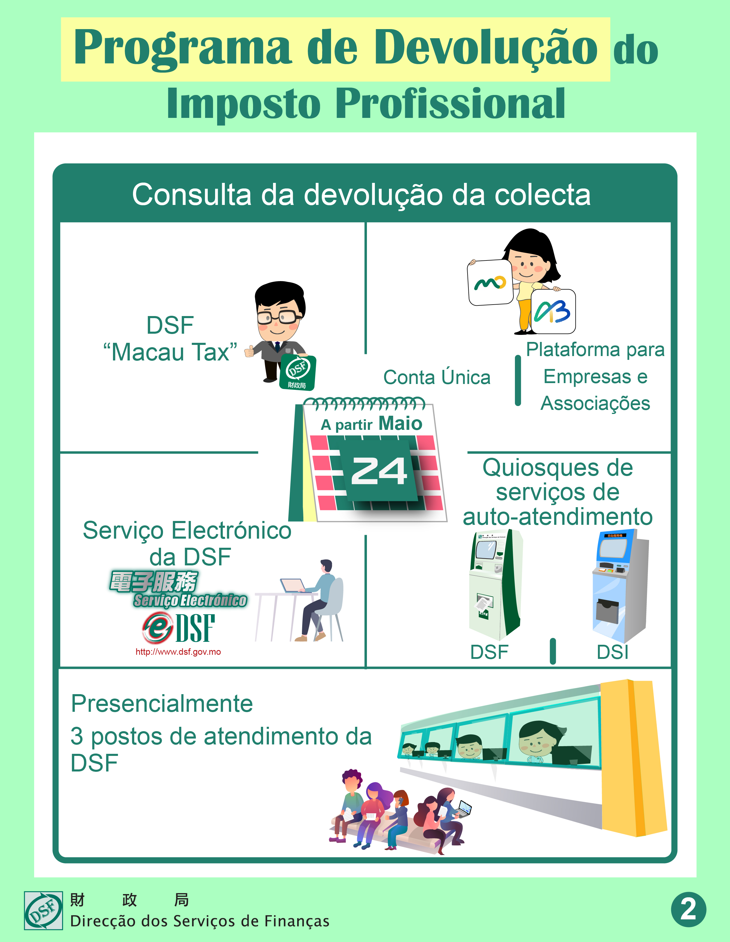 Nos termos do artigo 20.º da Lei n.º 22/2023 “Lei do Orçamento de 2024”, a partir de 24 de Maio, a Direcção dos Serviços de Finanças procede, de forma ordenada, à devolução de 60% da colecta do imposto profissional devido e pago relativamente ao ano de 2022, a cerca de 158.4 mil contribuintes do imposto profissional, titulares de bilhete de identidade residente da RAEM em 31 de Dezembro de 2022, até ao valor limite de $14 000 patacas, sendo o montante total de devolução envolvido de aproximadamente 916 milhões de patacas.