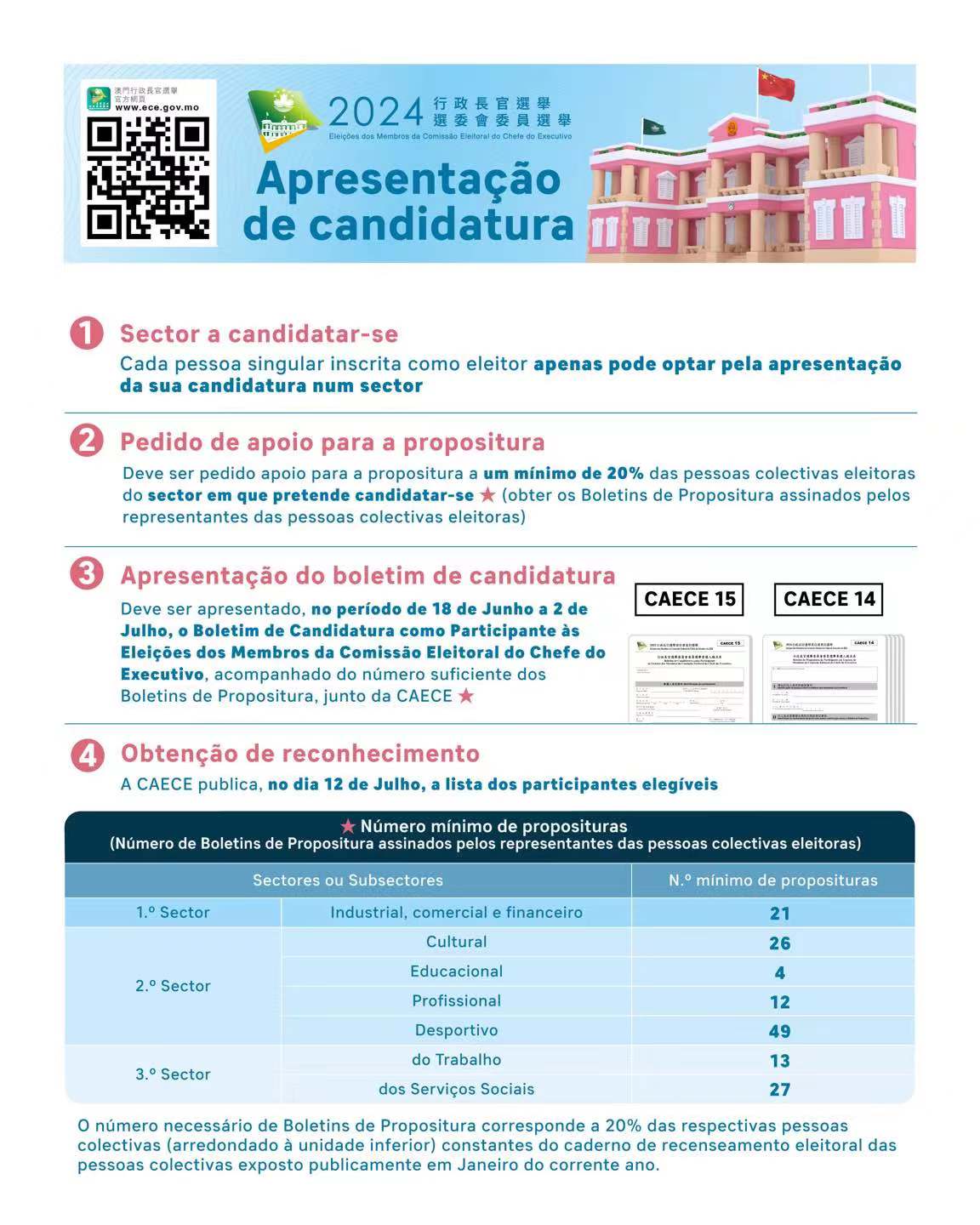 Os procedimentos para a apresentação do «Boletim de Registo do Representante que Assina o Boletim de Propositura», pelas pessoas colectivas eleitoras terá início no dia 3 de Junho. Até às 12h00 de hoje (14 de Junho), a CAECE recebeu um total de 369 boletins, representando 48 por cento das pessoas colectivas inscritas no recenseamento eleitoral. Song Man Lei também apelou às pessoas colectivas eleitoras para entregarem o respectivo boletim a tempo, até às 17h45 do dia 17 de Junho, no balcão de atendimento dos assuntos eleitorais, sito no Cave 1 do Edifício Administração Pública.