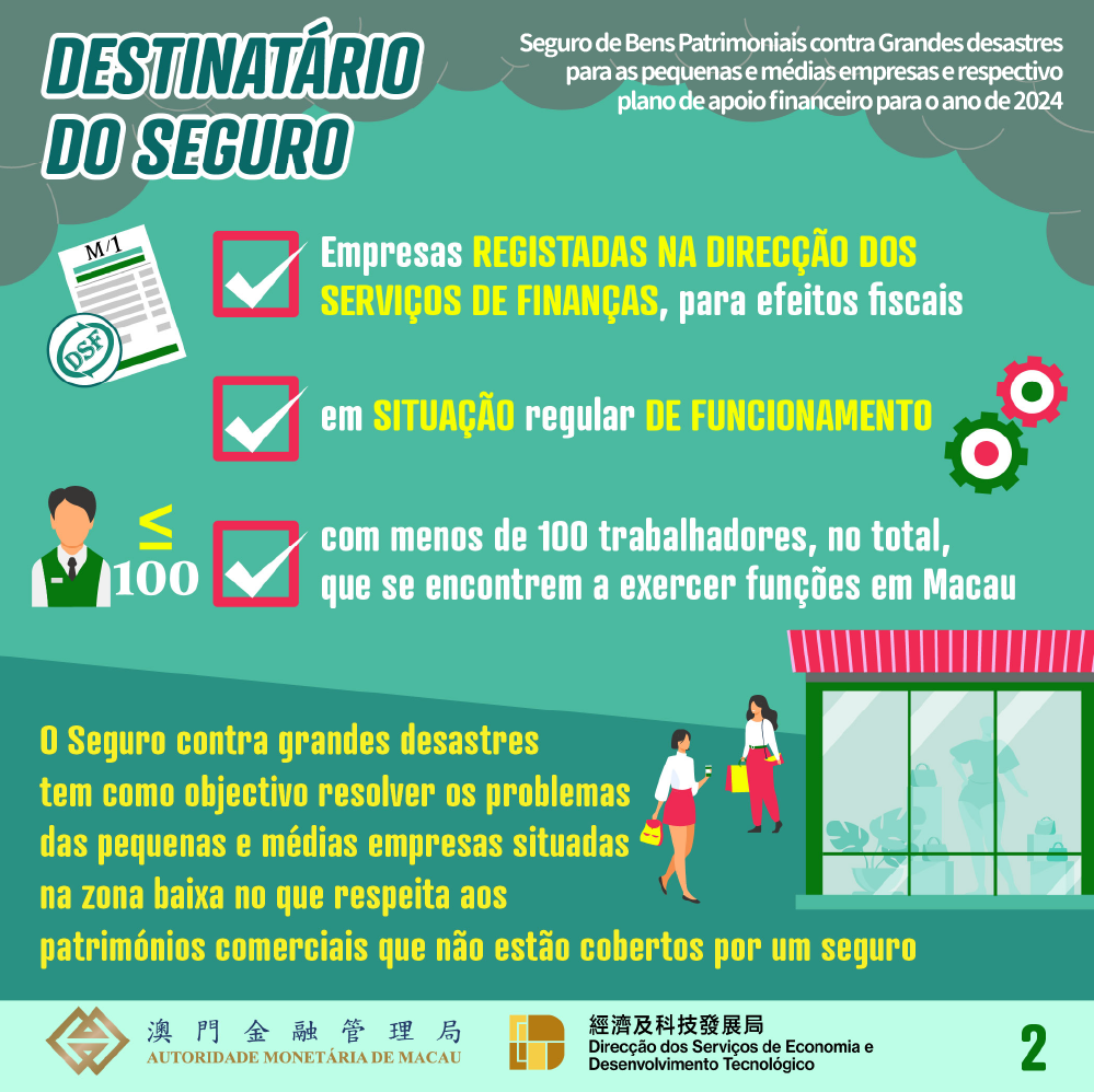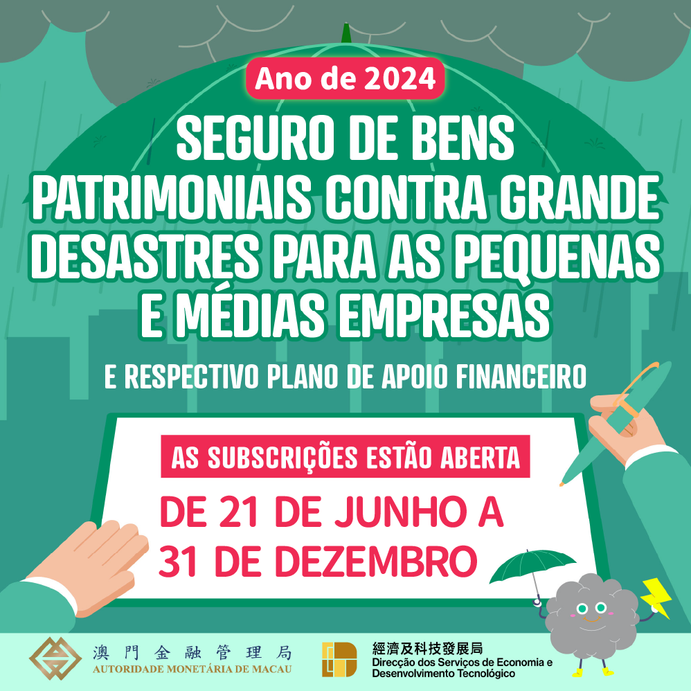 A subscrição do “Seguro de bens patrimoniais contra grandes desastres para as pequenas e médias empresas” (adiante designado por “Seguro contra grandes desastres”) e a apresentação do pedido do “Plano de apoio financeiro a conceder no âmbito do seguro de bens patrimoniais contra grandes desastres para as pequenas e médias empresas” (adiante designado por “Plano de apoio financeiro”) para o ano de 2024 serão aceites a partir do dia 21 de Junho até 31 de Dezembro do corrente ano. Em simultâneo, o Fundo de Desenvolvimento Industrial e de Comercialização continua a implementar medidas complementares como o designado “Plano de apoio financeiro”, no sentido de aliviar os encargos financeiros dos comerciantes.