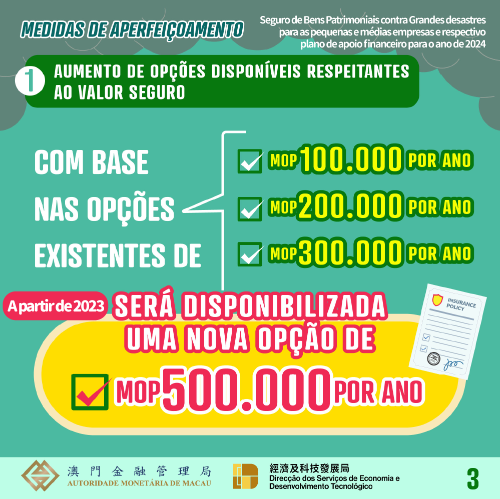 A partir de hoje (dia 21), as pequenas e médias empresas (PMEs) podem subscrever um “Seguro contra grandes desastres” para cada estabelecimento comercial, através das cinco seguradoras de Macau, participantes no programa supramencionado para o ano de 2024. No âmbito deste programa, existem quadros montantes seguros à escolha dos comerciantes, nomeadamente de MOP100.000, MOP200.000 e MOP300.000 e MOP500.000 (o último foi estabelecido no ano passado). Por outro lado, será dada a continuidade à medida de concessão de descontos nos prémios aos comerciantes que nunca apresentaram pedido de indemnização aquando da renovação de seguro, com descontos máximos de 35%.
