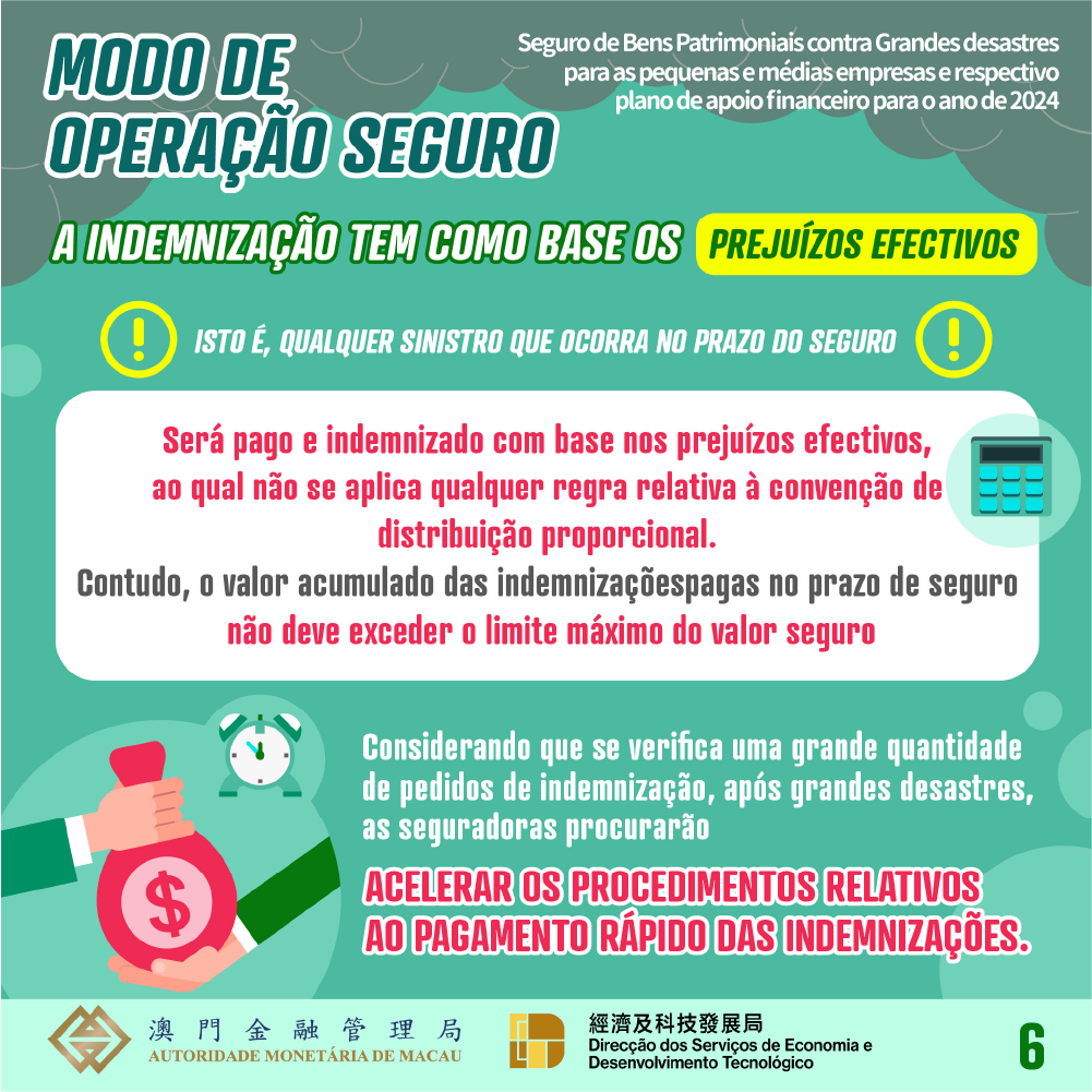 Para facilitar o processamento das formalidades respeitantes à aquisição de “Seguro contra grandes desastres” e à solicitação do apoio financeiro, “num só local”, por parte dos comerciantes interessados, as seguradoras podem ajudar a colectar e transferir os documentos do pedido de apoio financeiro. Por outro lado, face à premência e às dificuldades com que os comerciantes se confrontam, após grandes desastres, as seguradoras acelerarão os procedimentos com vista ao pagamento rápido das indemnizações.