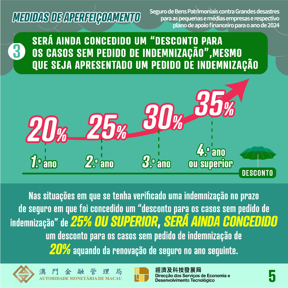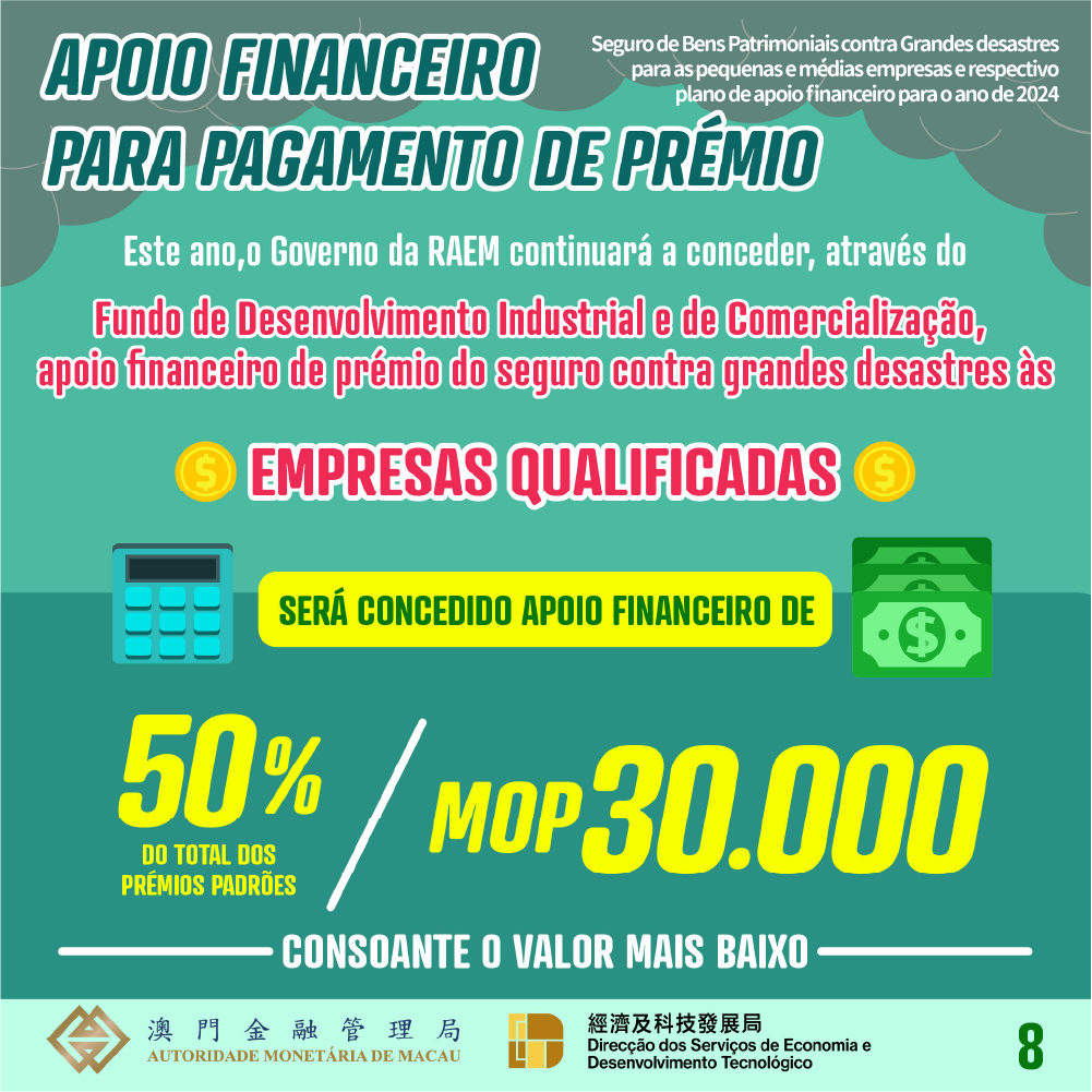 Entretanto, o Governo da RAEM continuará a conceder, através do Fundo de Desenvolvimento Industrial e de Comercialização, o apoio financeiro de prémio do seguro contra grandes desastres às PMEs qualificadas que preencham os requisitos estabelecidos, sendo que o valor do apoio financeiro equivale a 50% ou a MOP30.000 do total anual do prémio padrão (consoante o valor mais baixo), com o intuito de reduzir os encargos financeiros das mesmas. Aliás, com os subsídios concedidos pelo Governo, os prémios efectivamente pagos pelos comerciantes podem ascender até a 15% do total dos prémios originais, consoante a situação própria de cada comerciante, caso de trata de aquisição ou de renovação de seguros.