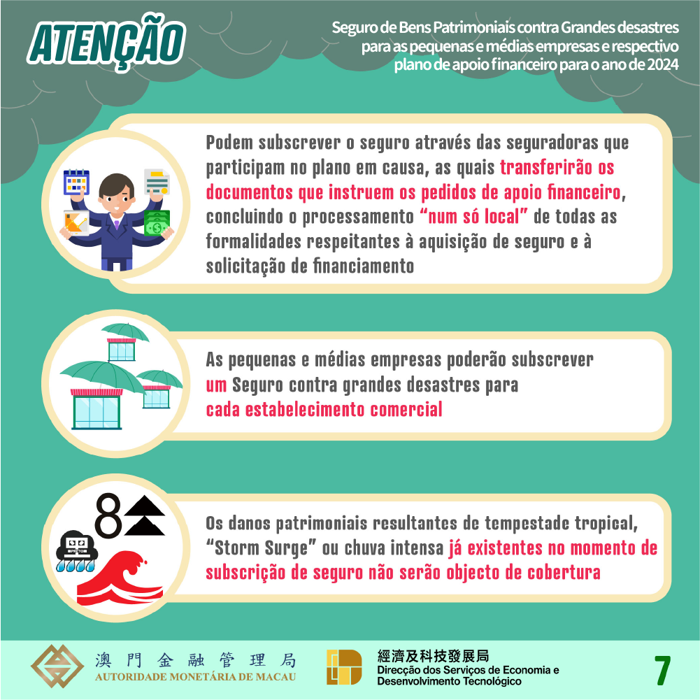 A página oficial da AMCM foi actualizada, constando informações detalhadas relativas ao “Seguro contra grandes desastres” para o ano de 2024, a lista das seguradoras autorizadas para prestar o referido seguro, bem como as informações sobre o Plano de apoio financeiro ( https://www.amcm.gov.mo/pt/about-amcm/about-amcm-typhoon-information?type=SME-Catastrophe-Property-Insurance-and-Subsidy-Scheme ). Para prestação de quaisquer esclarecimentos sobre o “Seguro contra grandes desastres”, queira, por favor, contactar, directamente as seguradoras em apreço, ou solicitar, durante o horário de expediente, informações sobre os seguintes assuntos junto da respectiva entidade competente: