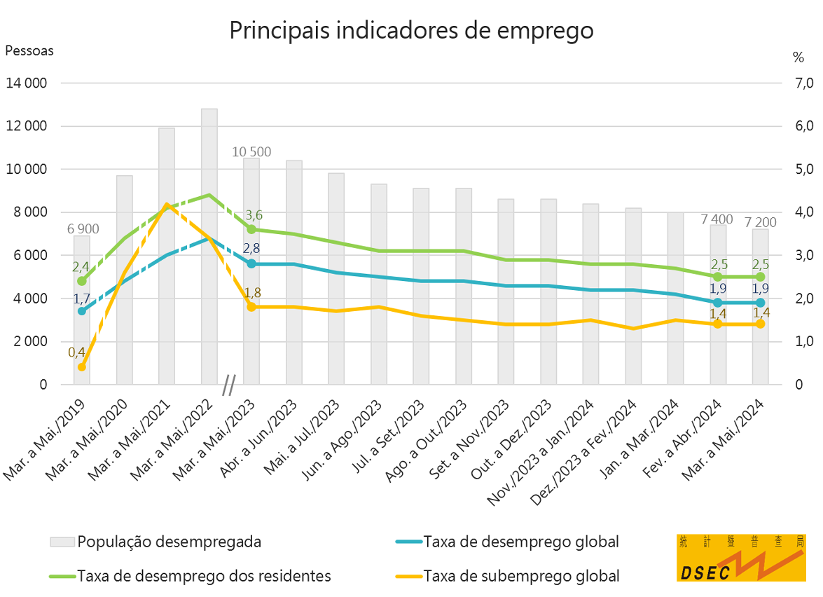 Entre Março e Maio de 2024 a taxa de desemprego global (1,9%) e a taxa de desemprego dos residentes (2,5%) mantiveram-se ambas idênticas às do período passado (Fevereiro a Abril de 2024), após terem caído por dois períodos consecutivos. Estes dois indicadores aproximaram-se dos níveis do período de Março a Maio de 2019. A taxa de subemprego manteve-se em 1,4%, informam os Serviços de Estatística e Censos.