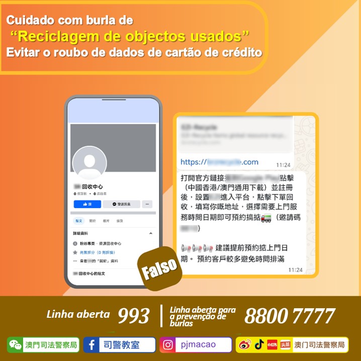 Recentemente, a Polícia Judiciária recebeu denúncias de vários cidadãos dizendo que, após terem visto na internet postagens sobre “recolha de pianos usados” ou “recolha de aparelhos eléctricos usados”, fizeram depois uma negociação tendo pago uma pequena “taxa de serviço” através de uma APP carregada conforme instruções recebidas. Entretanto, os dados dos respectivos cartões de crédito acabaram por serem roubados.