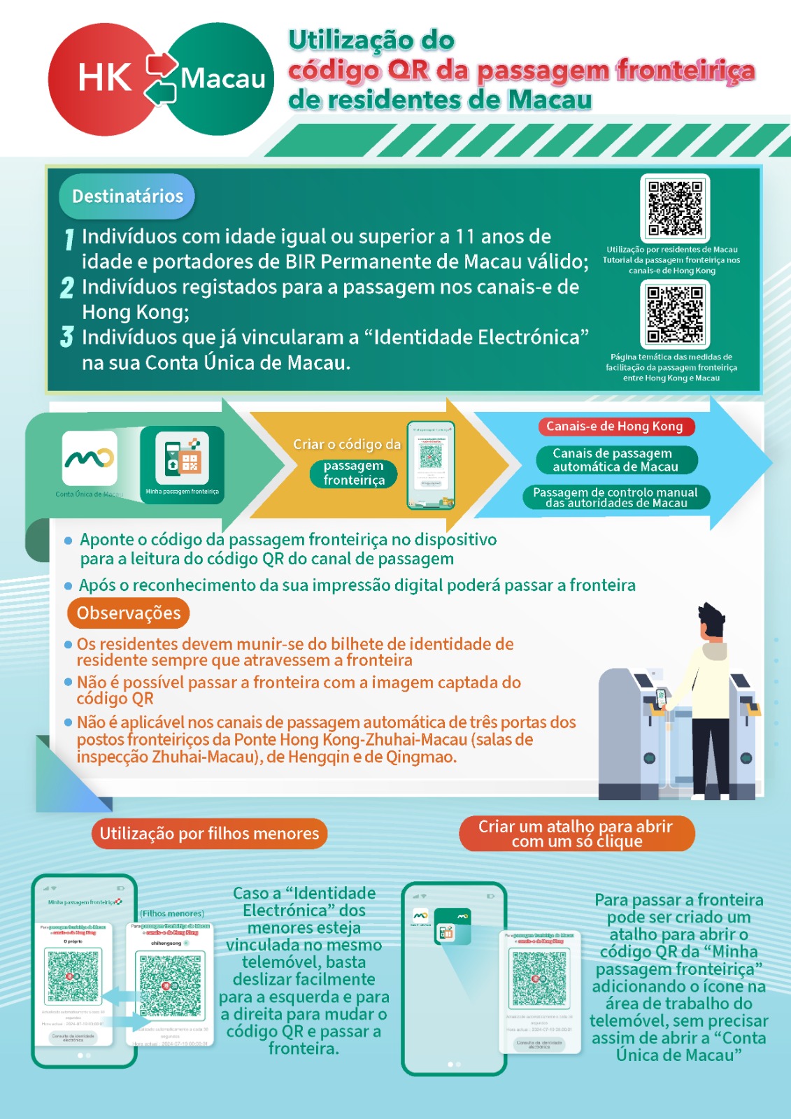 Para ajudar os residentes a criarem o código QR, a Direcção dos Serviços de Identificação (DSI), a Direcção dos Serviços de Administração e Função Pública (SAFP) e o Instituto para os Assuntos Municipais (IAM), no início da entrada em funcionamento do “código QR da passagem fronteiriça Hong Kong - Macau”, instalaram postos de assistência nos três postos fronteiriços, nomeadamente no Posto Fronteiriço de Macau da Ponte Hong Kong-Zhuhai-Macau, no Terminal Marítimo de Passageiros do Porto Exterior e no Terminal Marítimo de Passageiros da Taipa, empenhando-se na promoção da utilização deste código nas passagens de fronteira. Caso os residentes precisem de apoio na passagem fronteiriça através do “código QR da passagem fronteiriça Hong Kong - Macau”, são bem-vindos a deslocar-se aos postos de assistência acima referidos para consulta.