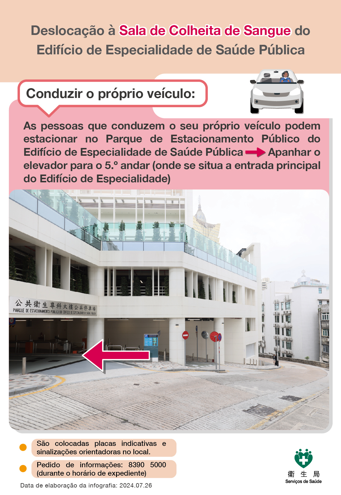As pessoas que conduzem o seu próprio veículo podem estacionar no “Parque de Estacionamento Público do Edifício de Especialidade de Saúde Pública” situado entre a Estrada Nova e a Estrada do Visconde de S. Januário, e apanhar o elevador para dirigir-se à Sala de Colheita de Sangue situada no 5.º andar (onde se situa a entrada principal do Edifício de Especialidade).