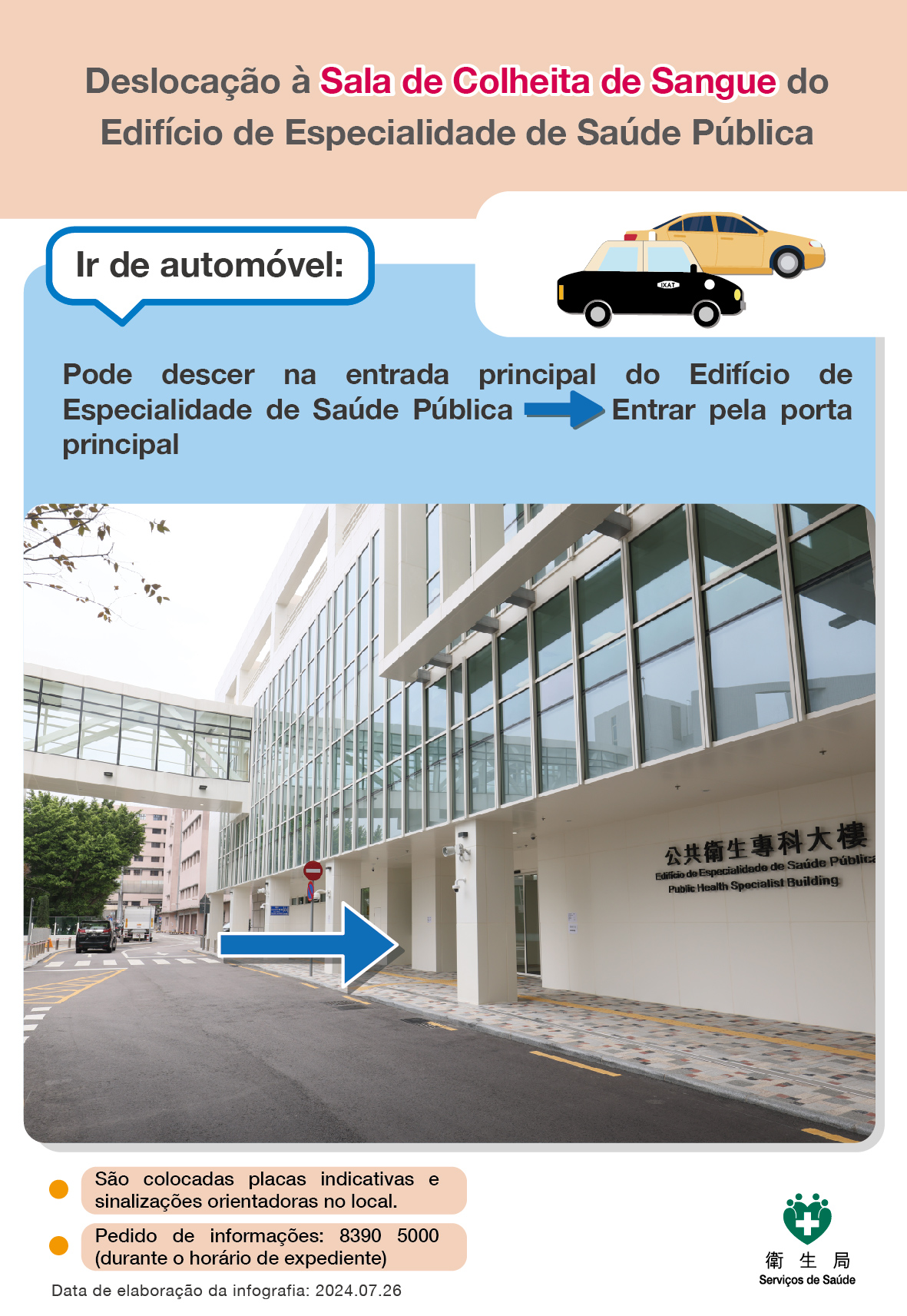 Os Serviços de Saúde lembram aos residentes que o elevador do Edifício de Especialidade de Saúde Pública entrou em funcionamento no dia 20 de Janeiro, a fim de permitir que os residentes possam ser submetidos à colheita de sangue numa zona mais espaçosa e confortável e ter uma melhor experiência a receber os serviços médicos. A partir do dia 2 de Abril, os serviços de colheita de sangue do Centro Hospitalar Conde de São Januário foram transferidos para a sala de recolha de amostras (Sala de Colheita de Sangue) do Edifício de Especialidade de Saúde Pública. Os residentes podem deslocar-se à sala de colheita de sangue através de vários percursos, nomeadamente: