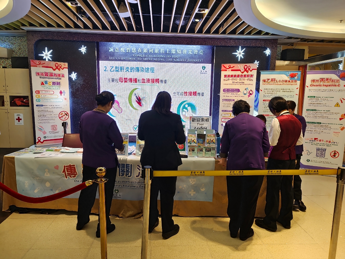 1. Entre Março e Junho, os Serviços de Saúde, em colaboração com as seis grandes empresas integradas de turismo e lazer de Macau, organizaram um total de 17 actividades itinerantes do “Dia de Acompanhamento das Doenças Transmissíveis”, através de jogos em tendinhas, painéis temáticos, distribuição de materiais promocionais e reprodução de vídeos promocionais, entre outros meios, os conhecimentos sobre hepatite B e C foram popularizados junto dos trabalhadores das empresas, tendo contado com a participação de mais de 4.000 pessoas.