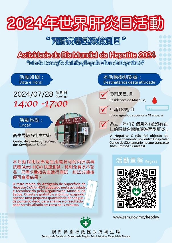 Com o intuito de implementar o “Projecto de Acção para Macau Saudável” e alcançar o objectivo de transformar Macau numa cidade saudável, os Serviços de Saúde, através do “Dia Mundial da Hepatite” que se celebra anualmente no dia 28 de Julho, em colaboração com as associações e empresas, organizaram várias actividades de promoção da saúde, a fim de elevar os conhecimentos dos residentes sobre a hepatite B e C e chamar à atenção dos residentes para a sua própria saúde. O tema do Dia Mundial da Hepatite deste ano é “Eliminar a hepatite, actuar activamente”.