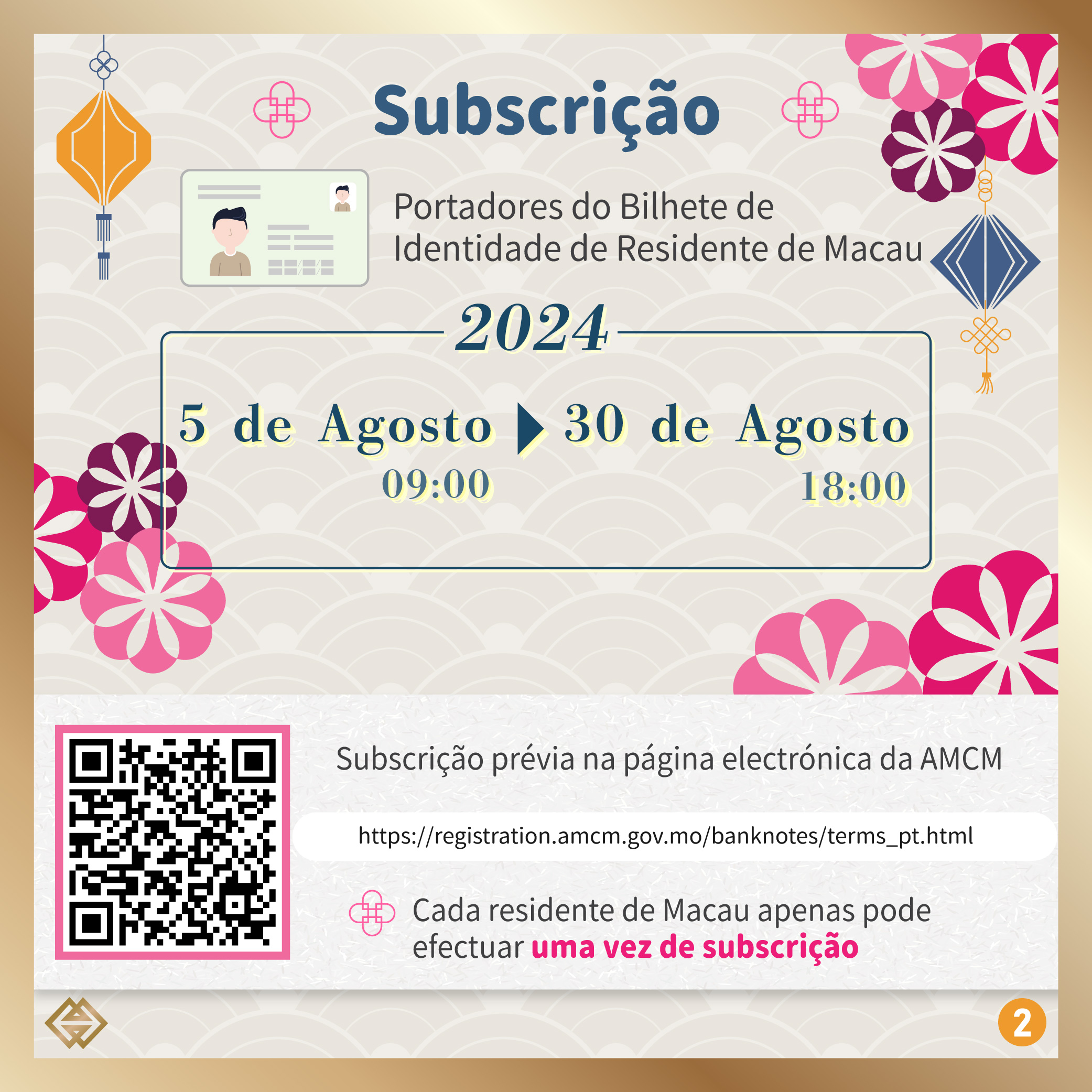 Ora, o período de troca decorre de 16 de Setembro a 6 de Dezembro de 2024. Assim, os residentes que tenham efectuado a subscrição para efeitos de troca pessoal ou no caso de designação de terceiros, devem comparecer, na data previamente agendada, no local indicado para a troca das notas, munidos dos documentos necessários e do respectivo montante das notas a serem trocadas. As informações detalhadas podem ser consultadas junto da página electrónica da AMCM: https://registration.amcm.gov.mo/banknotes/terms_pt.html. Para quaisquer esclarecimentos, favor contactar a linha aberta da AMCM durante o horário de expediente (telefone n.os 28565071/28565072)