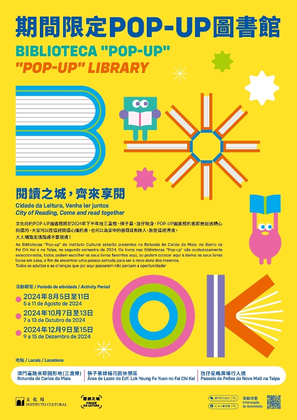 Por objectivo de reforçar a promoção da leitura nos bairros comunitários e de promover o princípio de que “incorporar a leitura na vida”, o Instituto Cultural irá promover a iniciativa “Biblioteca ‘POP-UP’” na segunda semana de Agosto, Outubro e Dezembro deste ano, na Rotunda de Carlos da Maia, no Fai Chi Kei e na Taipa, fornecendo livros de acesso gratuito aos residentes e fazendo com que a leitura nasça na comunidade.