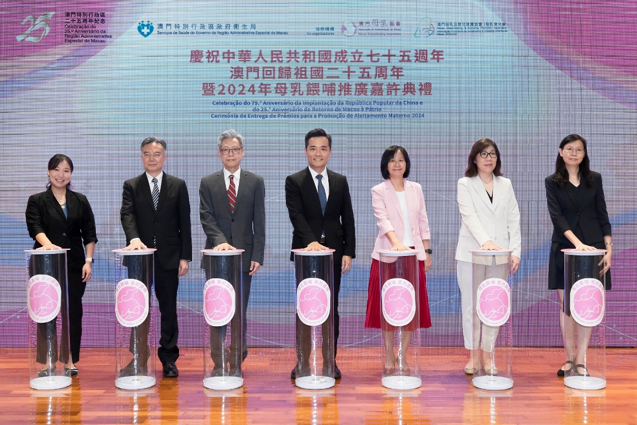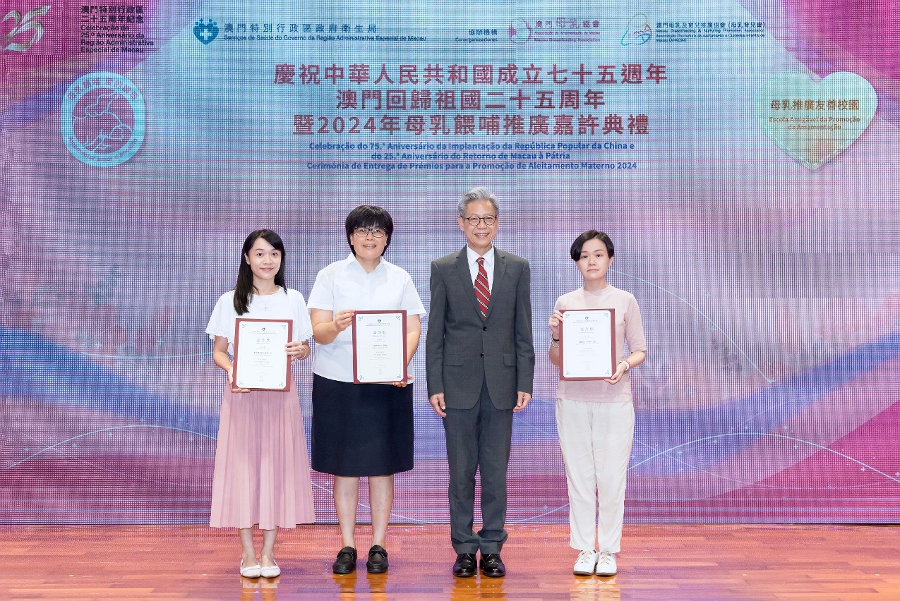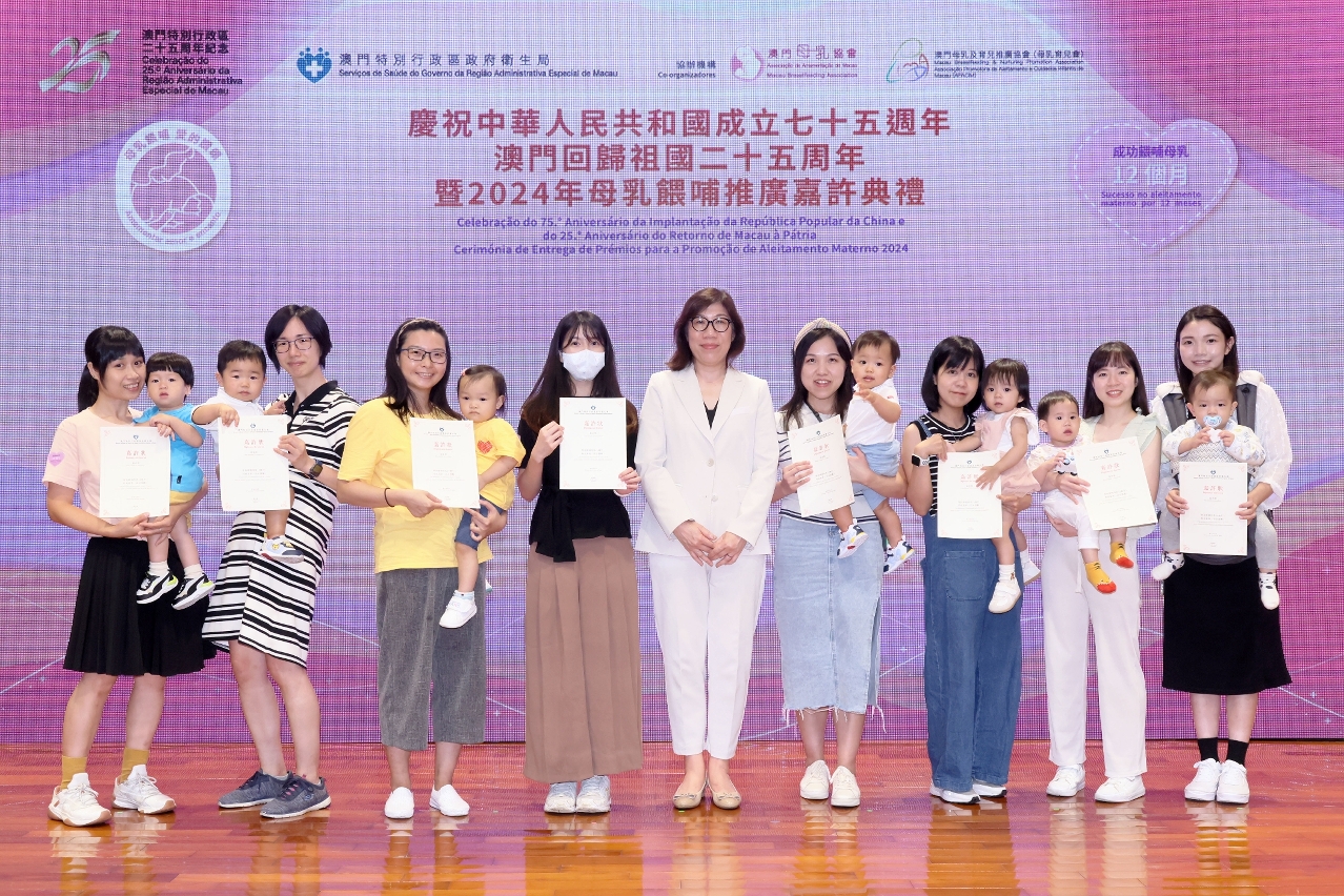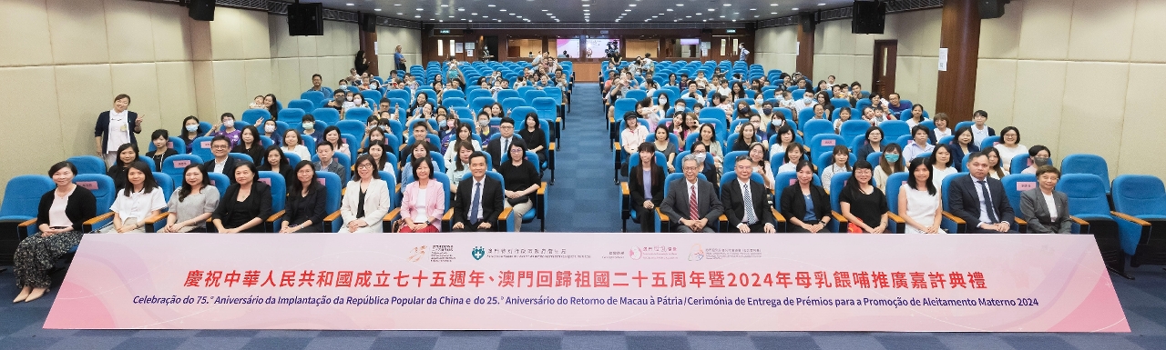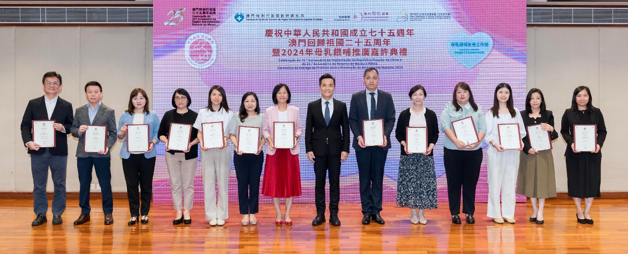 A “Cerimónia de Entrega de Prémios para a Promoção de Aleitamento Materno 2024”, organizada pelos Serviços de Saúde, com a colaboração da Associação de Amamentação de Macau e da Associação Promotora de Aleitamento e Cuidados Infantis de Macau, realizou-se nos últimos dias, com vista a assinalar a “Semana Internacional do Aleitamento Materno”. Estiveram presentes nesta cerimónia o Director dos Serviços de Saúde, Lo Iek Long, o Subdirector, Kuok Cheong U, o Subdirector, Chan Weng Wa, a Subdirectora, substituta, Loi I Leng, a Vice-Presidente do Conselho de Administração do Fundo de Segurança Social, Chan Pou Wan, bem como os representantes das 39 entidades públicas e privadas e das 3 escolas, e mais de 53 famílias (no total de cerca de 200 participantes).