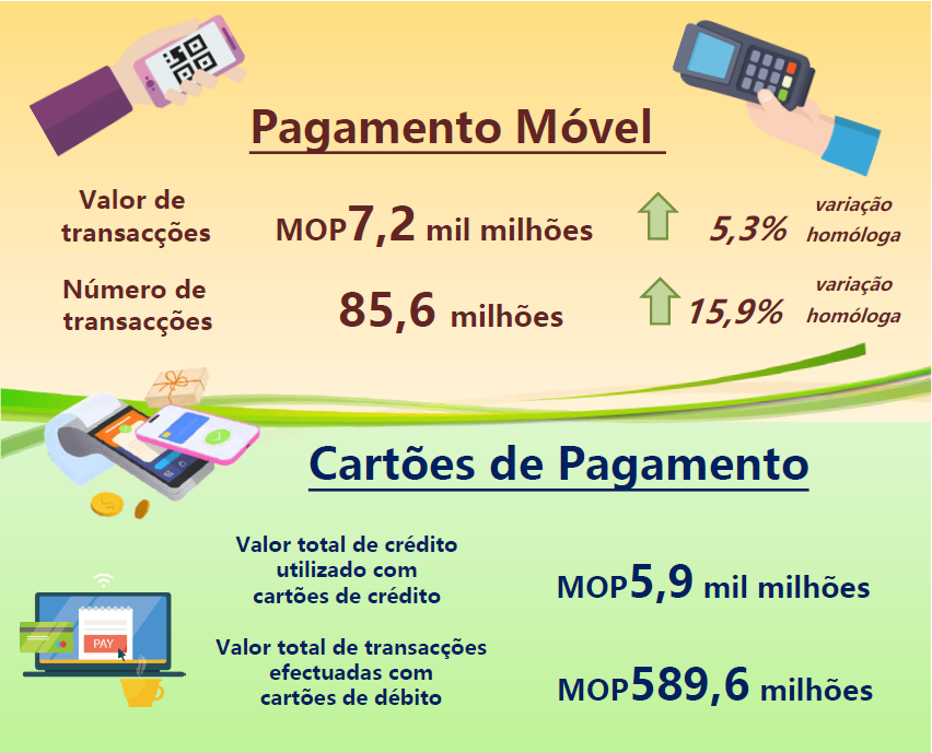 No segundo trimestre de 2024, o crédito utilizado no período atingiu MOP5,9 mil milhões, o que representou um crescimento de 1,1% em comparação com o ano anterior. O adiantamento de numerário atingiu MOP156,3 milhões, correspondendo a 2,6% do total do crédito utilizado no período. O número de transacções realizadas com cartões de crédito totalizou 11,2 milhões, o que representou um acréscimo de 23,1% face ao ano anterior. O montante do reembolso, incluindo os juros e despesas, foi de MOP5,9 mil milhões, o que representou um aumento de de 1,7% relativamente ao ano anterior. Além disso, o número de transacções realizadas com cartões de débito (não incluindo o levantamento de numerário) totalizou 961,7 mil e o valor total de transacções efectuadas com cartões de débito foi de MOP589,6 milhões.