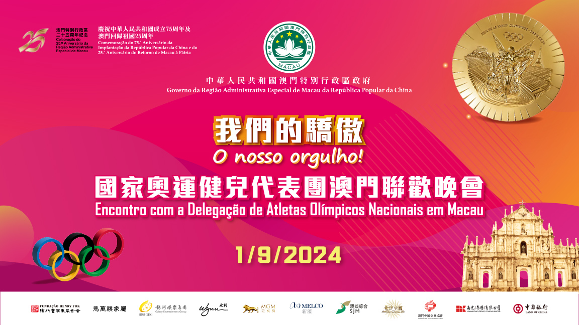 Com vista a celebrar o 75.º Aniversário da Implantação da República Popular da China e o 25.º Aniversário do Regresso de Macau à Pátria e sob a solidariedade e o apoio do País, a delegação de atletas olímpicos nacionais vai estar em Macau durante 3 dias, entre 31 de Agosto e 2 de Setembro, uma visita organizada conjuntamente pelo Governo da Região Administrativa Especial de Macau, a Administração Geral de Desporto do Estado e o Gabinete dos Assuntos de Hong Kong e Macau junto do Conselho de Estado. É uma oportunidade para que a população possa testemunhar de perto o encanto dos atletas, partilhando a felicidade com todos.
