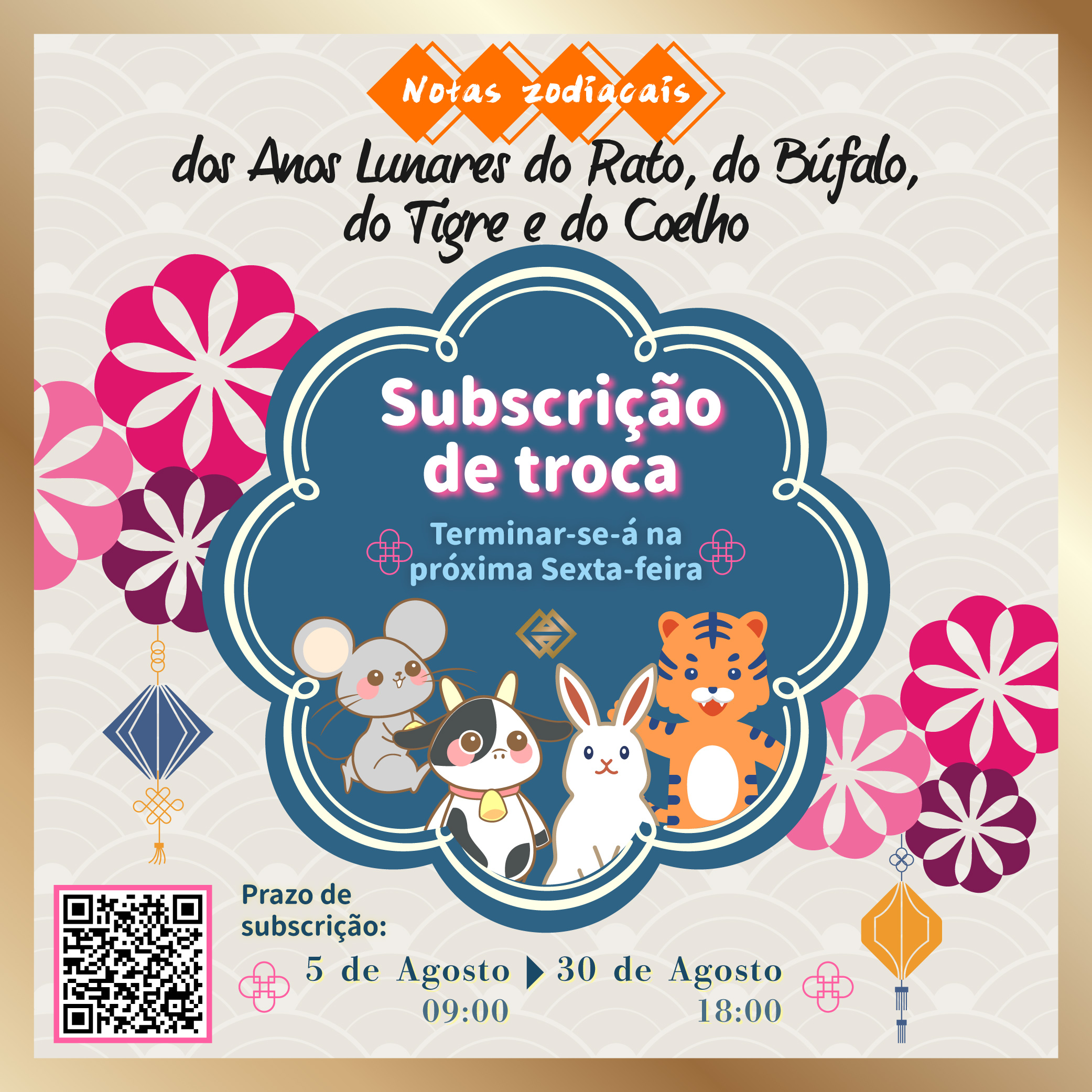 O termo do prazo para subscrição das notas zodiacais dos Anos Lunares do Rato, do Búfalo, do Tigre e do Coelho emitidas pelos dois bancos emissores decorrerá até às 18 horas de 30 de Agosto de 2024 (Sexta-feira), sendo que a Autoridade Monetária de Macau (AMCM) informa os residentes que pretendam subscrever as notas em causa que o devem fazer, até ao termo do prazo indicado.