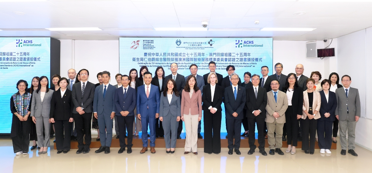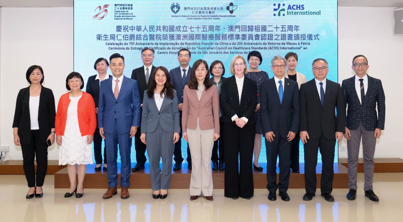 No dia 26, foi realizada pelos Serviços de Saúde a Celebração do 75.º Aniversário da Implantação da República Popular da China e do 25.º Aniversário do Retorno de Macau à Pátria/Cerimónia de Entrega do Certificado de Acreditação do Australian Council on Healthcare Standards (ACHSI) International ao Centro Hospitalar Conde de São Januário dos Serviços de Saúde, na qual a Directora Executiva da ACHSI, Drª. Louise Cuskelly, atribuiu o certificado de acreditação ao Director do CHCSJ, Dr. Kuok Cheong U, na presença da Secretária para os Assuntos Sociais e Cultura, Drª. Ao Ieong U, da Chefe do Gabinete da Secretária para os Assuntos Sociais e Cultura, Drª. Ho Ioc San e do Director dos Serviços de Saúde, Dr. Lo Iek Long,