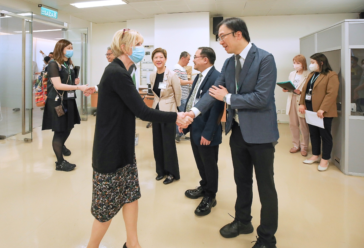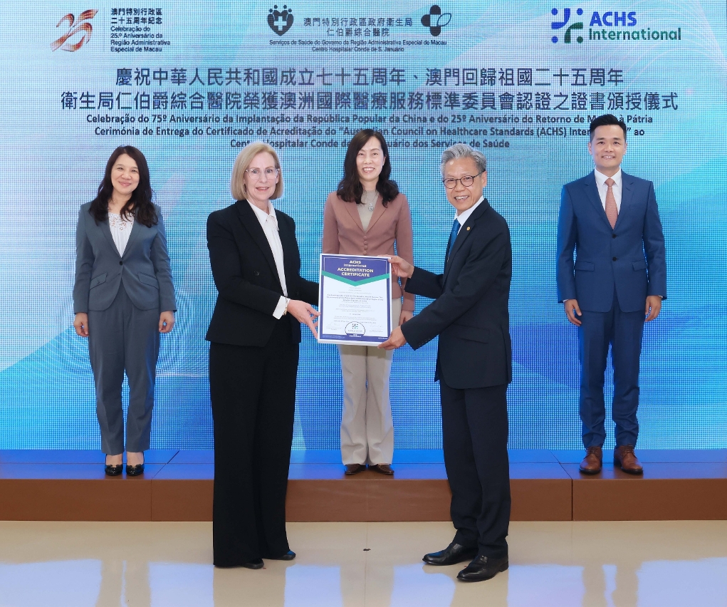 • A Directora Executiva da ACHSI, Drª. Louise Cuskelly, atribuiu o certificado de acreditação ao Director do CHCSJ, Dr. Kuok Cheong U, na presença da Secretária para os Assuntos Sociais e Cultura, Drª. Ao Ieong U, da Chefe do Gabinete da Secretária para os Assuntos Sociais e Cultura, Drª. Ho Ioc San e do Director dos Serviços de Saúde, Dr. Lo Iek Long