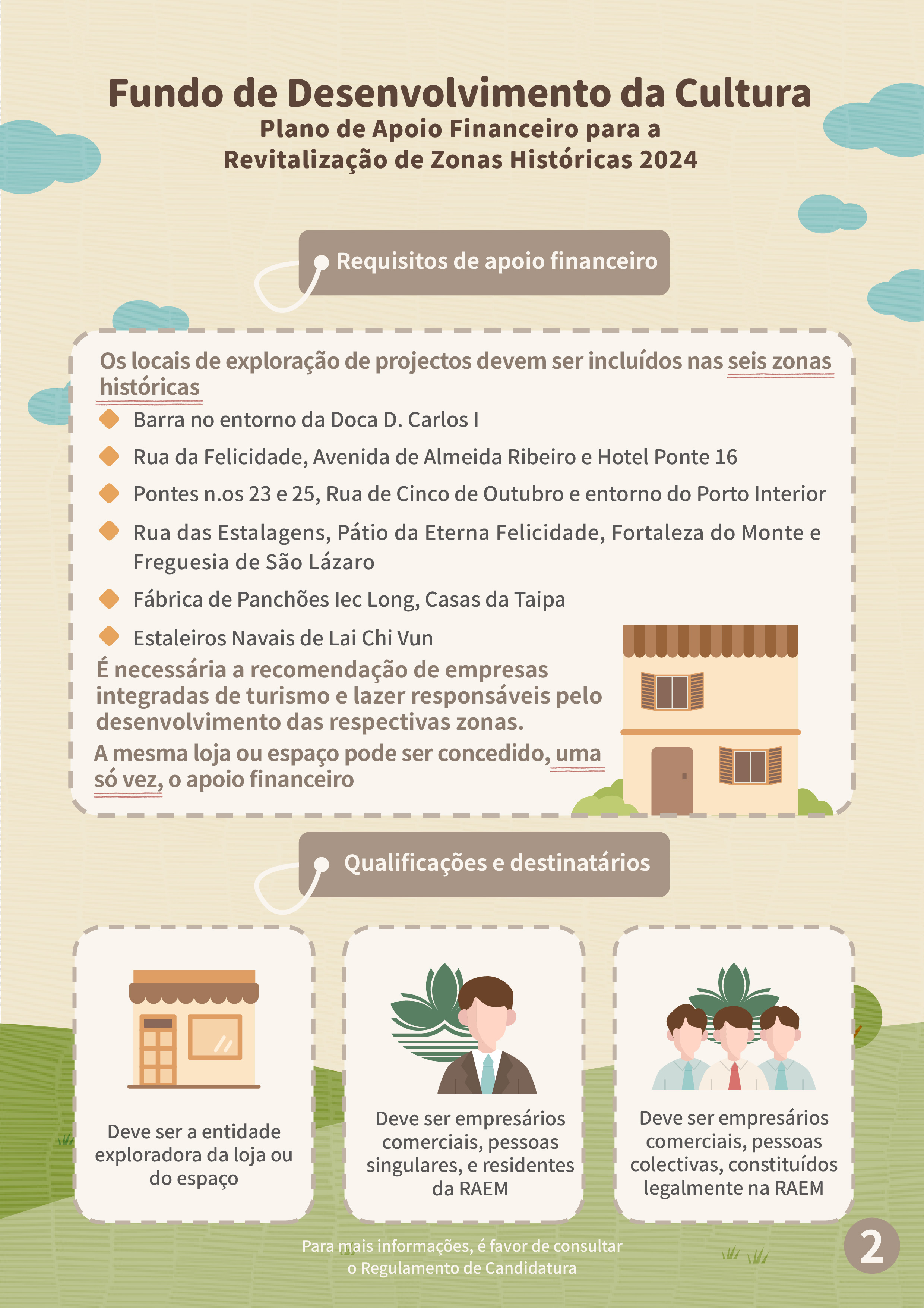 O candidato deve ser empresário comercial, pessoa singular ou colectiva, estabelecido nos termos da lei em Macau, e ser a entidade exploradora da loja ou do espaço. O local de funcionamento do projecto deve situar-se numa das seis zonas históricas, sendo necessária a recomendação de empresas integradas de turismo e lazer responsáveis pelo desenvolvimento das respectivas zonas. A mesma loja ou espaço pode ser concedido, uma só vez, o apoio financeiro no âmbito deste Plano.