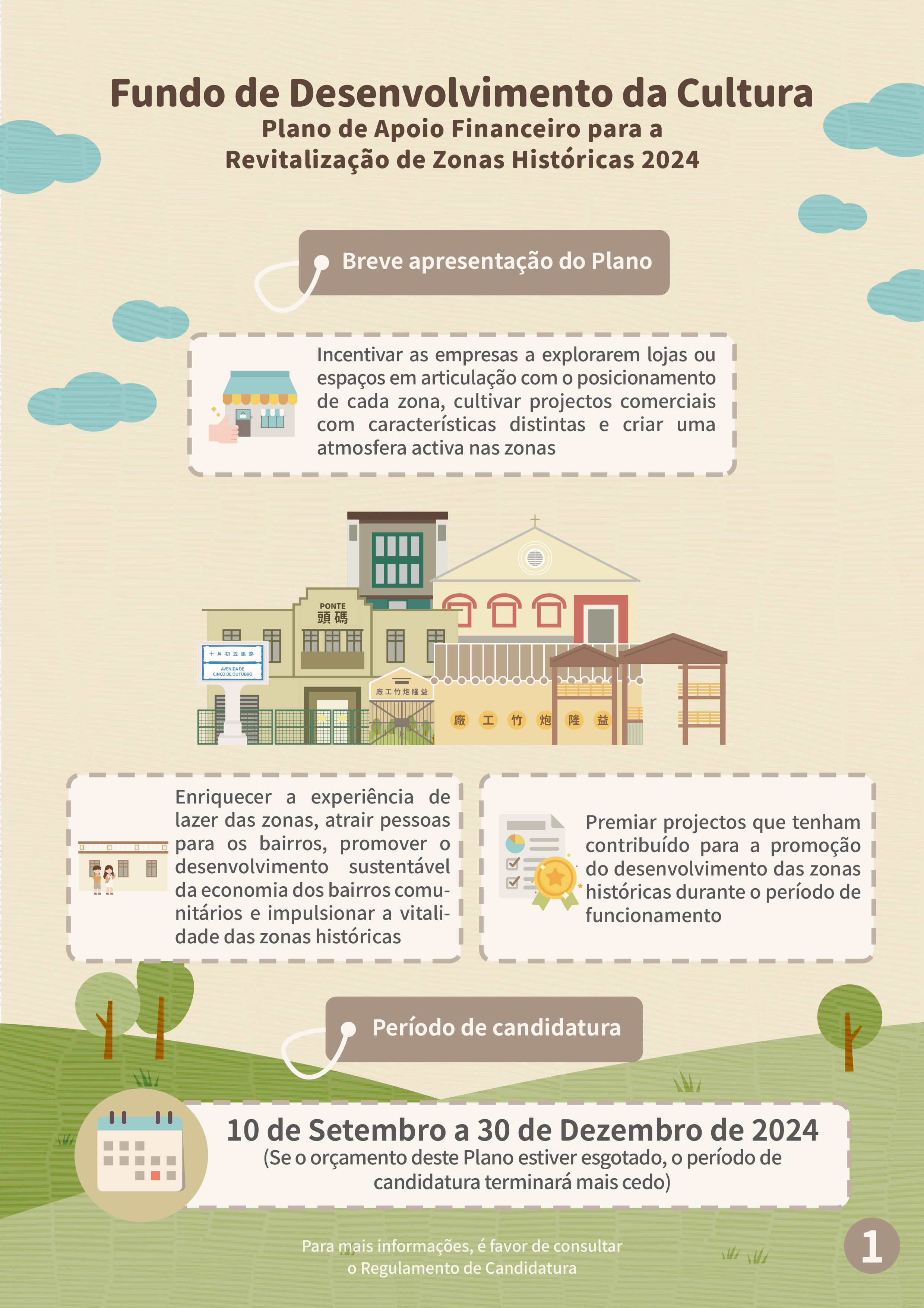O Fundo de Desenvolvimento da Cultura (adiante designado por “FDC”) aceitará candidaturas ao “Plano de apoio financeiro para a revitalização de zonas históricas 2024” (adiante designado por “Plano”) de 10 de Setembro a 30 de Dezembro, visando incentivar as empresas a explorarem lojas ou espaços em articulação com o posicionamento de cada zona, cultivar projectos comerciais com características distintas e criar uma atmosfera activa nas zonas e impulsionar a vitalidade das zonas históricos, premiando ainda projectos que tenham contribuído para a promoção do desenvolvimento das zonas históricas durante o período de funcionamento.