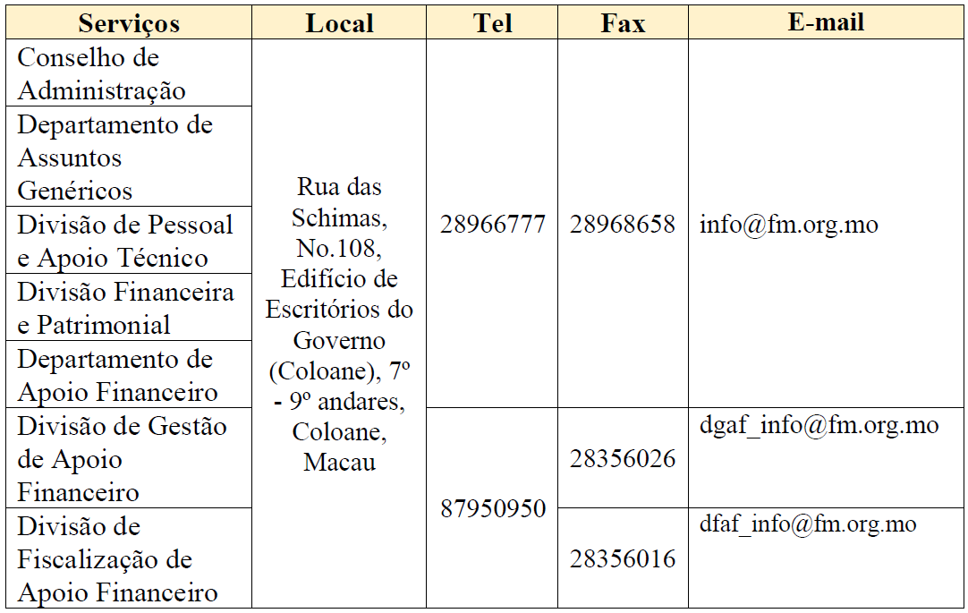 A Fundação Macau, a partir de 17 de Setembro de 2024 (Terça-feira), passará a funcionar, na Rua das Schimas, No.108, 7º - 9º andares do Edifício de Escritórios do Governo, em Coloane, mantendo-se inalterados os números de contacto (telefone e fax), e-mail e website. A actual sede situada na Avenida de Almeida Ribeiro, NºS 61-75, Circle Square,7°- 9° andares, será encerrada a partir daquela data.