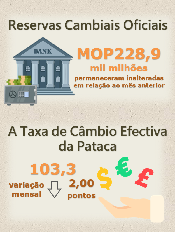 A taxa de câmbio efectiva da pataca, ponderada pelas suas quotas do comércio, foi de 103,3 em Agosto de 2024, registando decréscimos de 2,00 pontos e 0,49 pontos, respectivamente, relativamente aos dados do mês anterior e ao período homólogo de 2023, implicando que globalmente, a pataca caiu face às moedas dos principais parceiros comerciais de Macau.