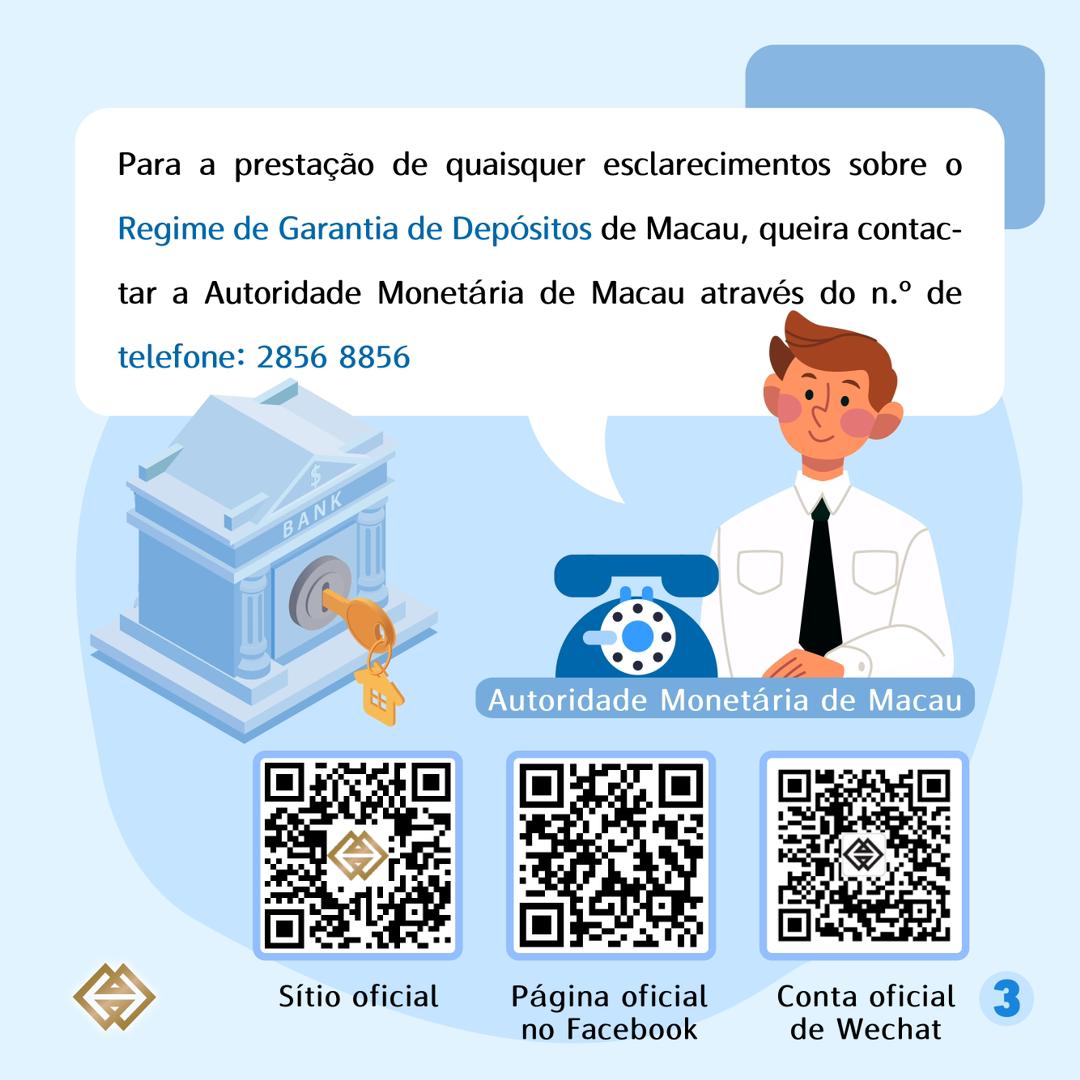 Para a prestação de quaisquer esclarecimentos sobre o Regime de Garantia de Depósitos de Macau, queira contactar a Autoridade Monetária de Macau através do n.º de telefone: 2856 8856.