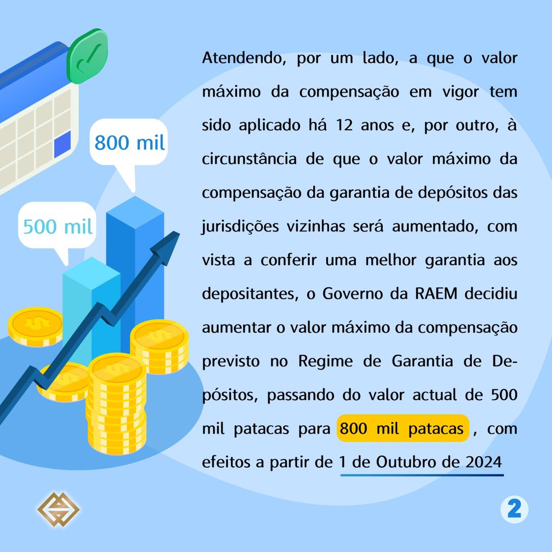 O limite do valor da compensação do Regime de Garantia de Depósitos será aumentado para 800 mil patacas, a partir de 1 de Outubro de 2024. Atendendo, por um lado, a que o valor máximo da compensação em vigor tem sido aplicado há 12 anos e, por outro, à circunstância de que o valor máximo da compensação da garantia de depósitos das jurisdições vizinhas será aumentado, com vista a conferir uma melhor garantia aos depositantes, o Governo da RAEM decidiu aumentar o valor máximo da compensação previsto no Regime de Garantia de Depósitos, passando do valor actual de 500 mil patacas para 800 mil patacas. Para o efeito, o novo Regulamento Administrativo intitulado “Limite do valor da compensação do Regime de Garantia de Depósitos” foi publicado dia 16 no Boletim Oficial da Região Administrativa Especial de Macau, que entrará em vigor no dia 1 de Outubro de 2024.