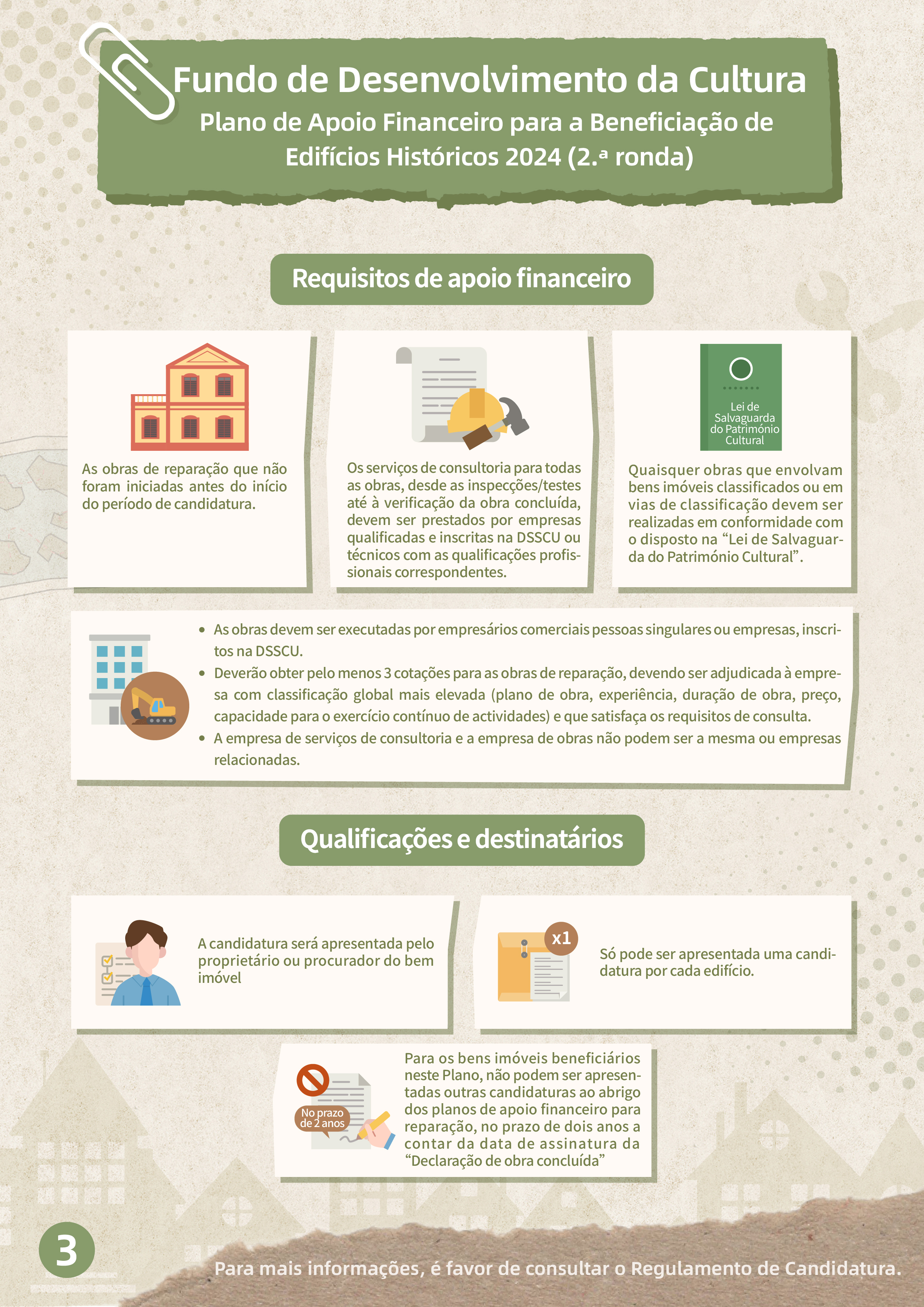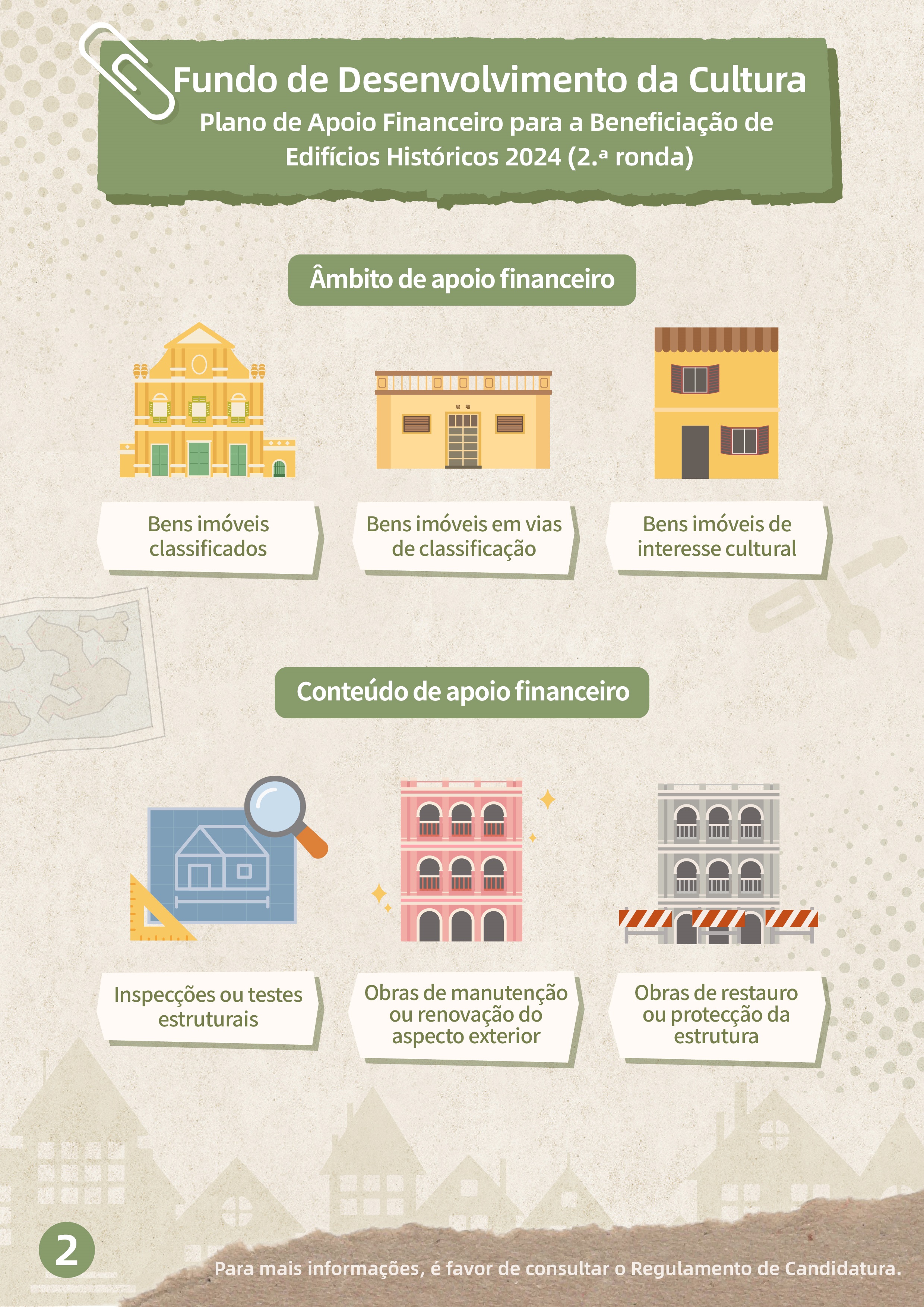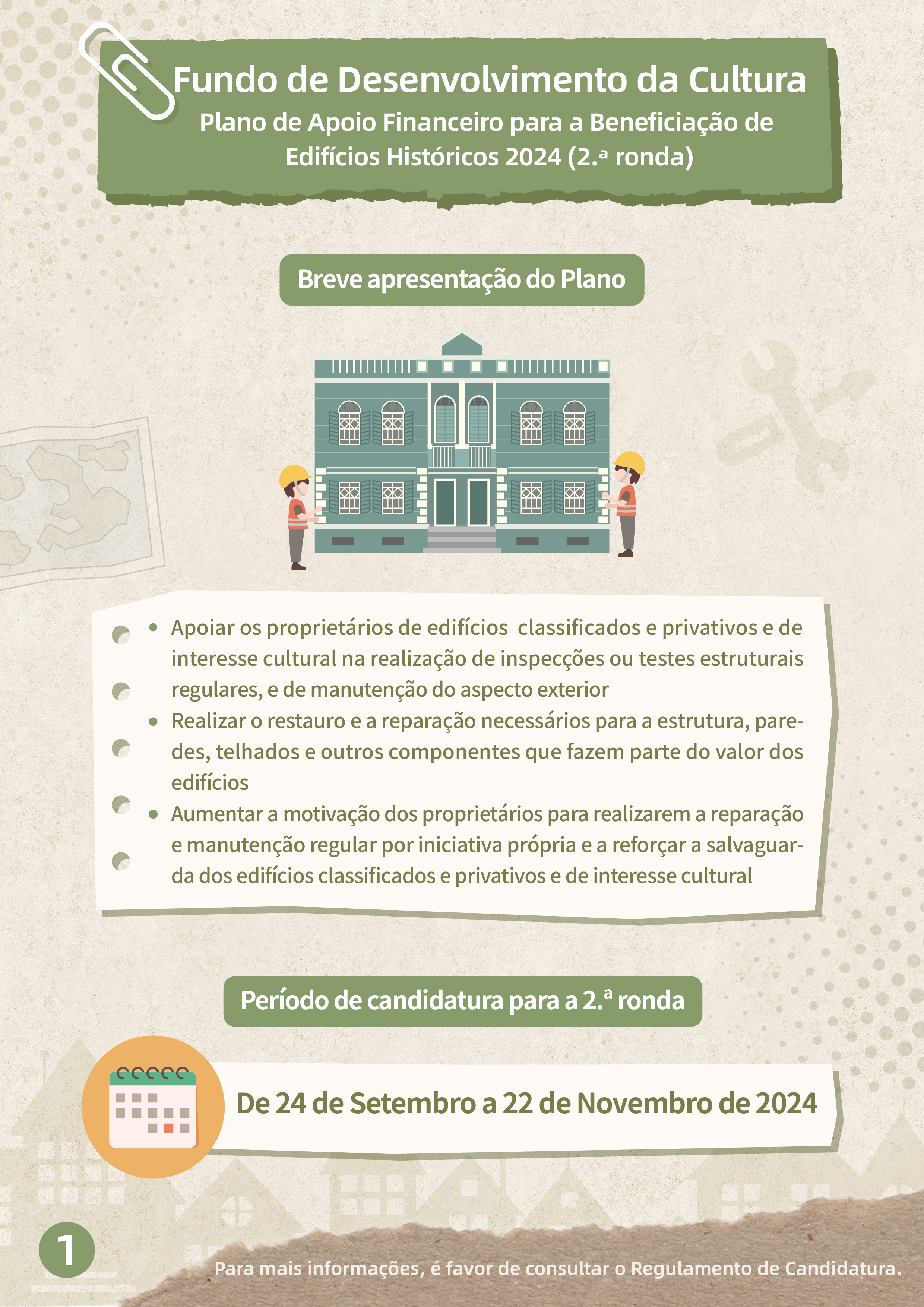 Por outro lado, serão aceites candidaturas, de 24 de Setembro a 22 de Novembro, à 2.ª ronda do “Plano de apoio financeiro para a beneficiação de edifícios históricos 2024”, para apoiar os proprietários de edifícios classificados e privativos, e de interesse cultural na realização de inspecções ou testes estruturais regulares, de reparação externa, bem como, de restauro e reparação necessários de acordo com os resultados dos testes. O âmbito de apoio financeiro inclui os bens imóveis classificados, em vias de classificação e de interesse cultural para os quais ainda não tenham sido iniciadas obras de reparação antes do início do período de candidatura, devendo as candidaturas ser apresentadas pelos proprietários ou procuradores dos bens imóveis. O apoio financeiro é sob a forma de subsídio que varia entre 50% e 80% das despesas previstas, com um limite máximo de 2 milhões de patacas, por um período de apoio financeiro de 12 meses, sendo o orçamento total deste Plano de 10 milhões de patacas.