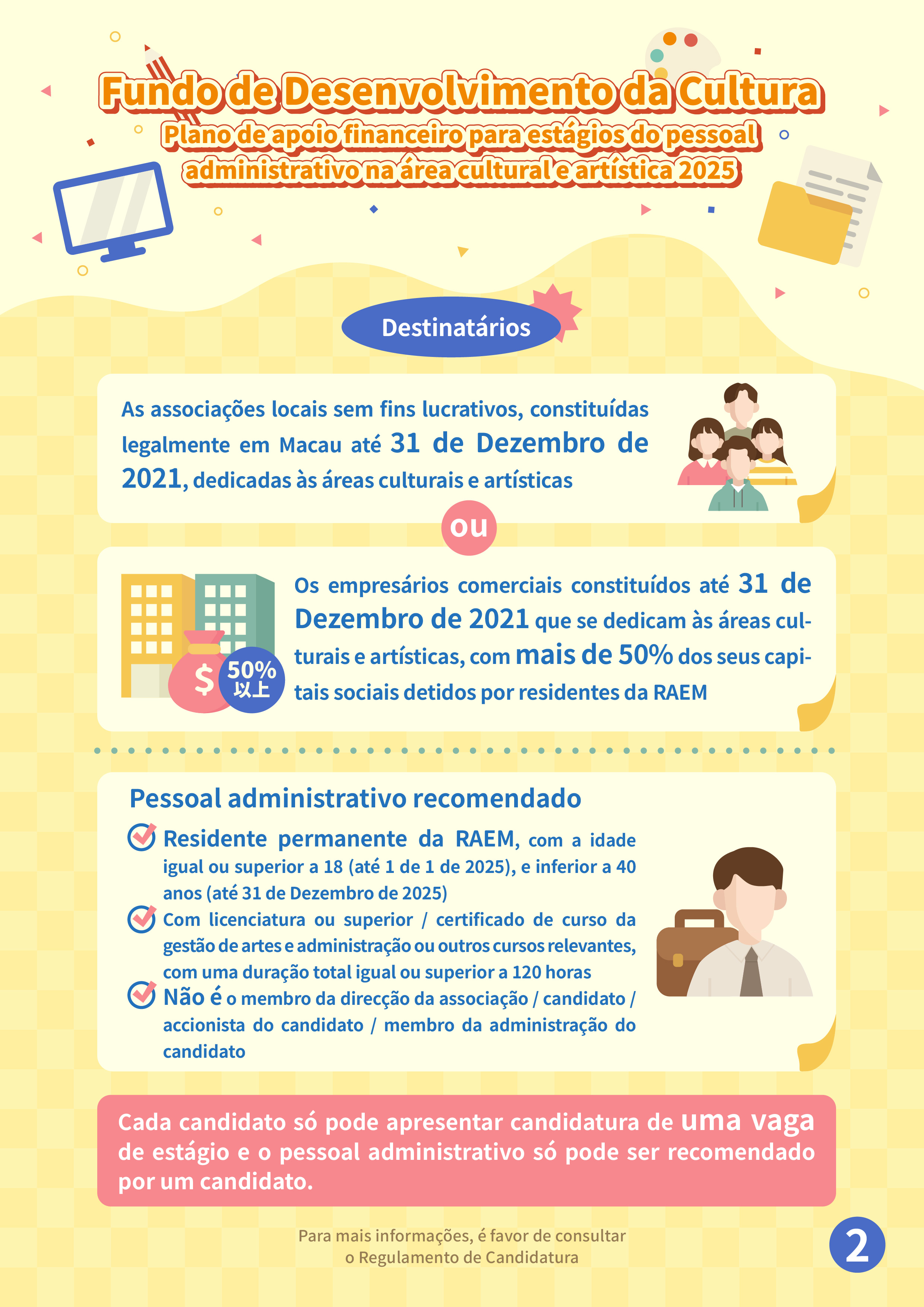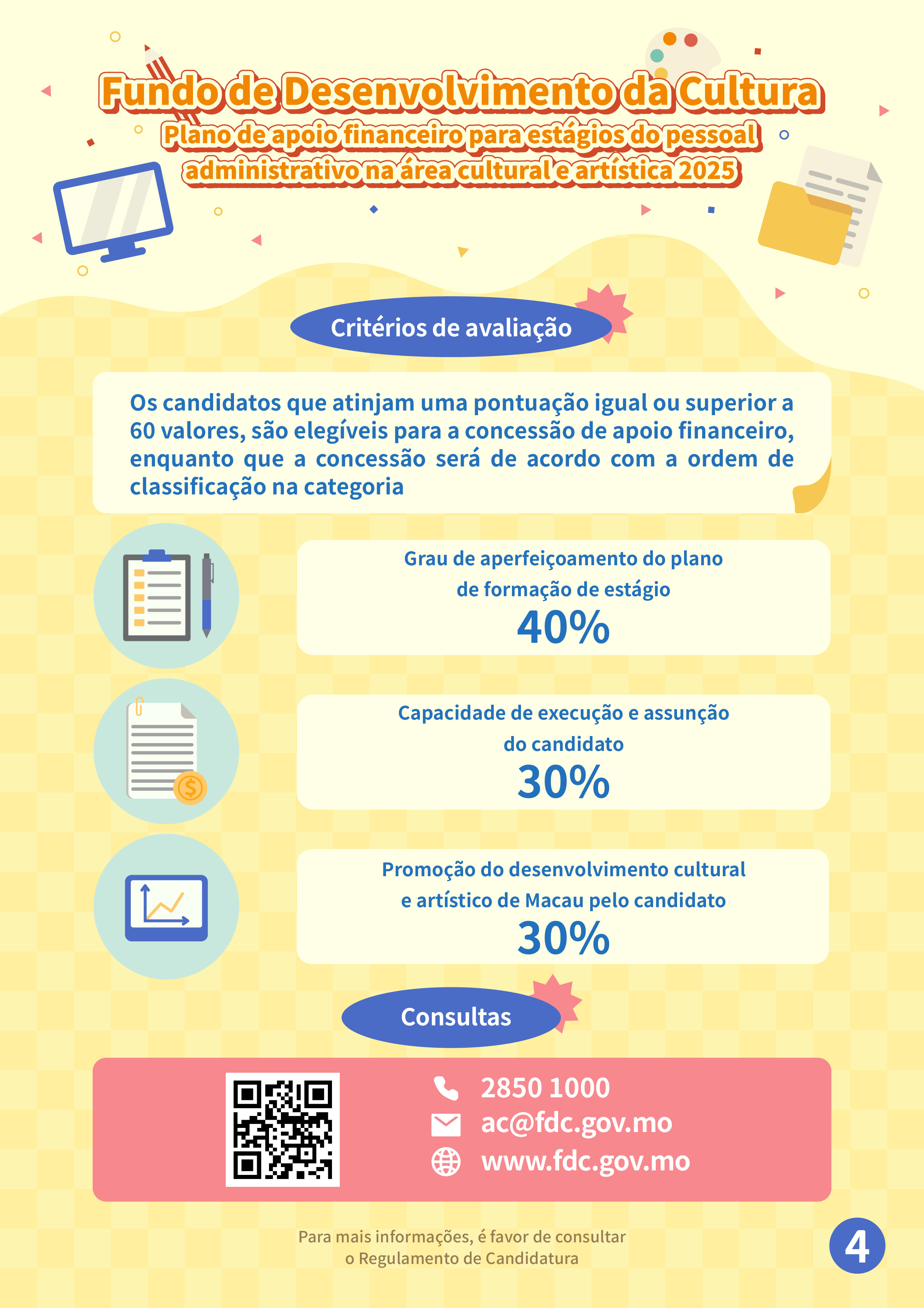Com vista a apresentar em detalhe os assuntos sobre as candidaturas ao “Plano de apoio financeiro para estágios do pessoal administrativo na área cultural e artística 2025” e responder às dúvidas dos candidatos, será realizada uma sessão de esclarecimento no dia 3 de Outubro, às 17h00, no Auditório situado no 7.º andar do Edifício Centro Comercial Cheng Feng (Endereço: Alameda Dr. Carlos d’Assumpção 322-362), podendo os interessados inscrever-se na página electrónica do FDC (www.fdc.gov.mo): “Sistema de marcação” no âmbito da “Área dos serviços electrónicos e de descarregamento”. Para quaisquer consultas, é favor de contactar-nos através do telefone, n.º 2850 1000 ou por email, ac@fdc.gov.mo.