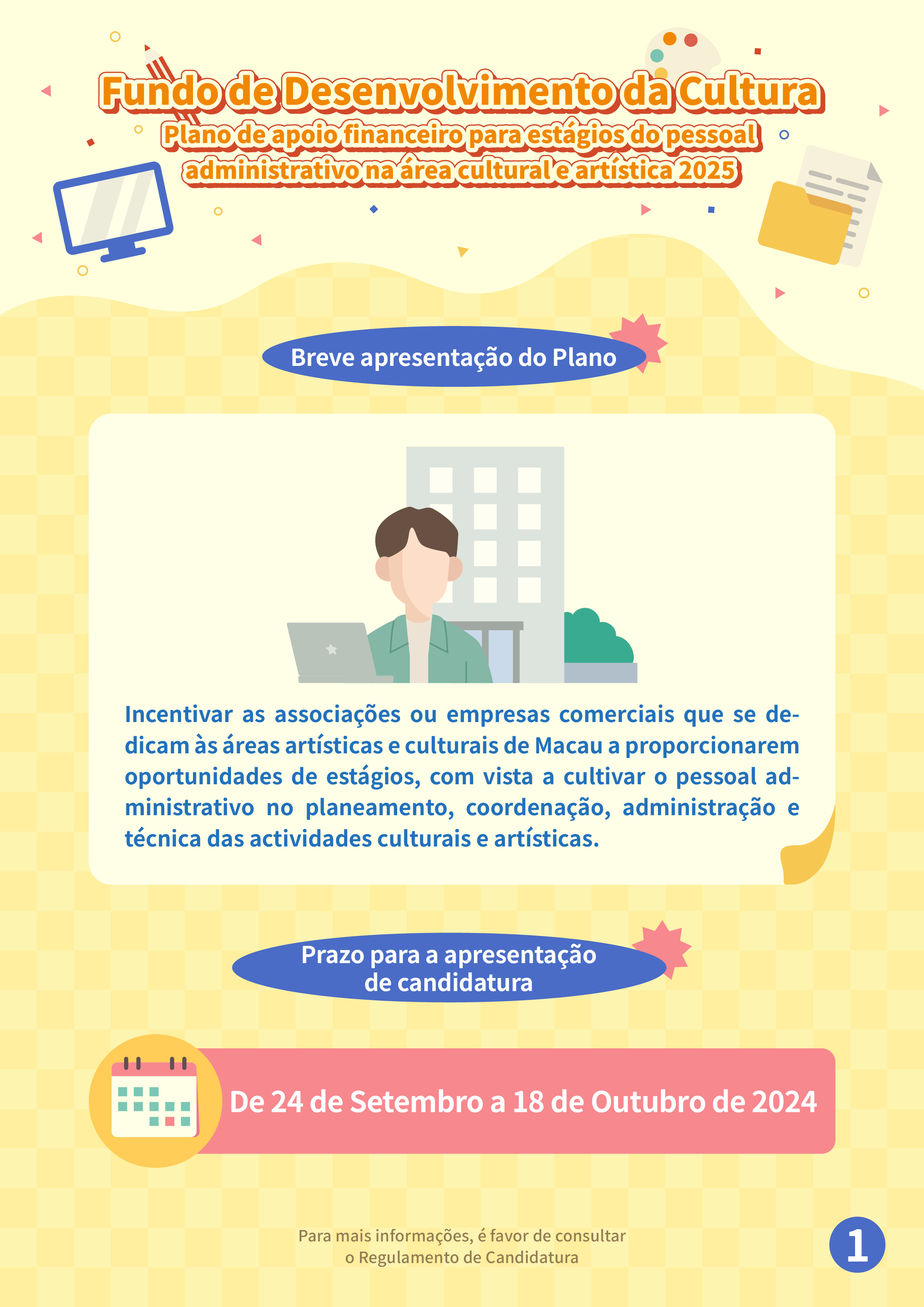 De 24 de Setembro a 18 de Outubro, estarão abertas as candidaturas ao “Plano de apoio financeiro para estágios do pessoal administrativo na área cultural e artística 2025”, visando encorajar as associações ou empresas comerciais que se dedicam às áreas artísticas e culturais de Macau, a proporcionar oportunidades de estágios no planeamento, coordenação, administração e técnica das actividades culturais e artísticas. As associações ou empresários comerciais que se candidatem, podem recomendar um residente permanente de Macau, com idade compreendida entre os 18 e os 40 anos. Serão subsidiadas as despesas de estágio em 2025 para o pessoal administrativo que reúna os requisitos, até um máximo de 151.200 patacas, que serão reembolsadas de acordo com o número total de horas do estágio efectivo. O número de beneficiários é de 80, incluindo um limite máximo de 70 para o grupo das associações e de 10 para o grupo dos empresários.