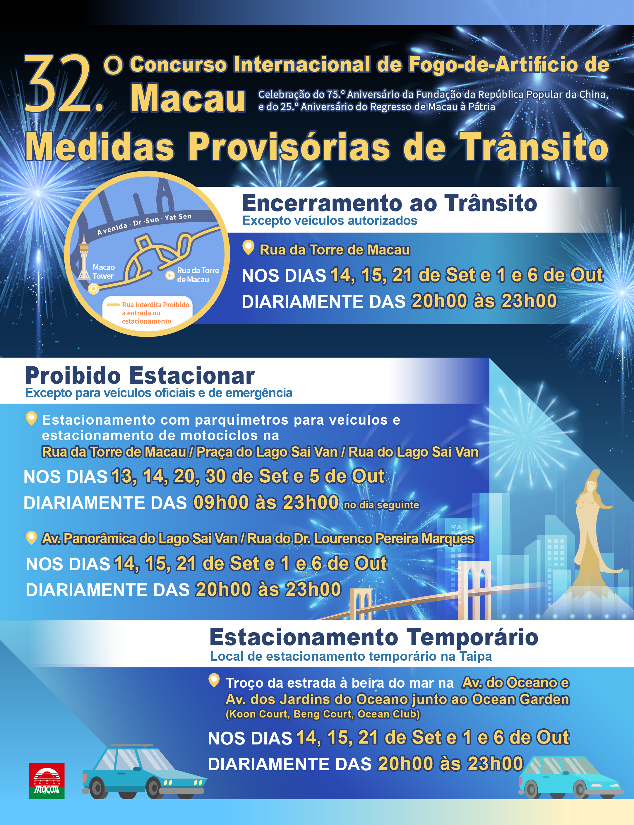 Infografia sobre medidas provisórias de trânsito do evento “Celebração do 75.º Aniversário da Fundação da RPC e do 25.º Aniversário do Regresso de Macau à Pátria - 32.° Concurso Internacional de Fogo-de-Artifício de Macau”
