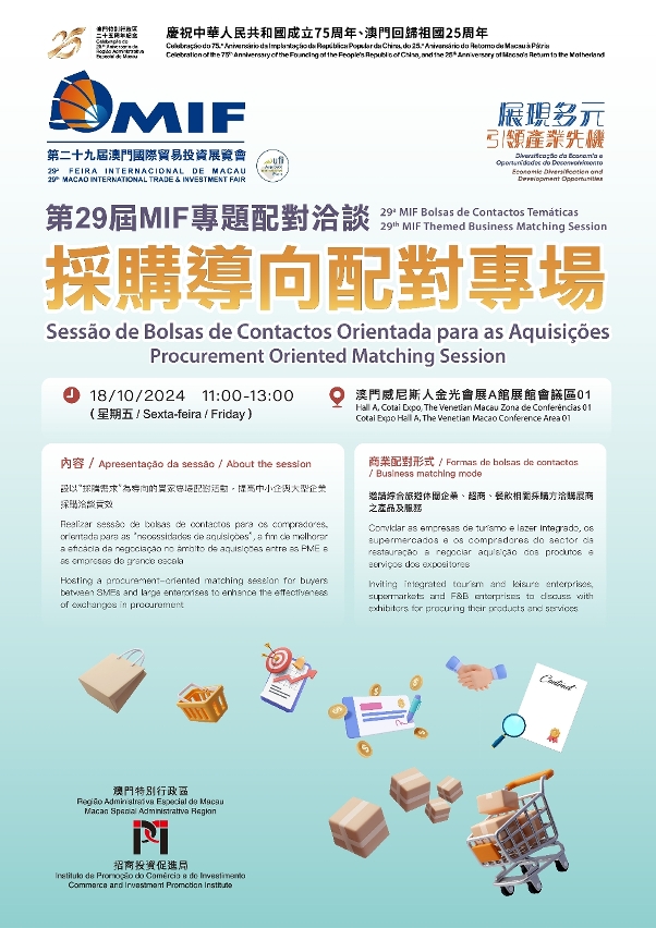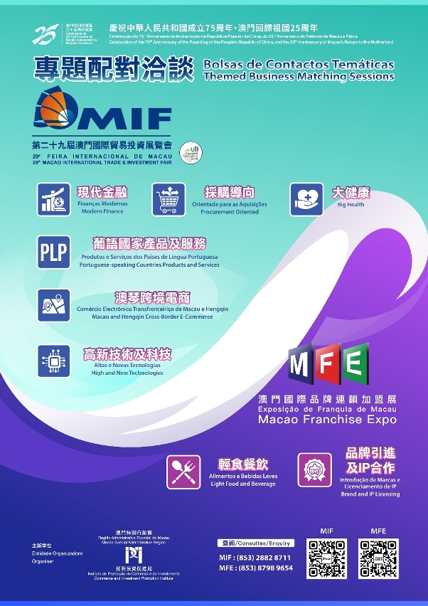 No âmbito das actividades alusivas à celebração do 75.º Aniversário da Implantação da República Popular da China e do 25.º Aniversário do Retorno de Macau à Pátria, na 29.ª Feira Internacional de Macau (29.ª MIF) e na Exposição de Franquia de Macau 2024 (2024MFE), será realizado um total de 8 sessões temáticas de bolsas de contactos. Estes eventos proporcionarão aos comerciantes locais, nacionais e internacionais uma plataforma de intercâmbio económico e comercial, cobrindo áreas como as indústrias “1+4”, o comércio entre a China e os Países de Língua Portuguesa, as oportunidades de negócio entre Macau e Hengqin, as marcas internacionais em franquia e a indústria de propriedade intelectual (PI), viabilizando o acesso das diferentes partes aos recursos internacionais e à expansão das suas redes comerciais.