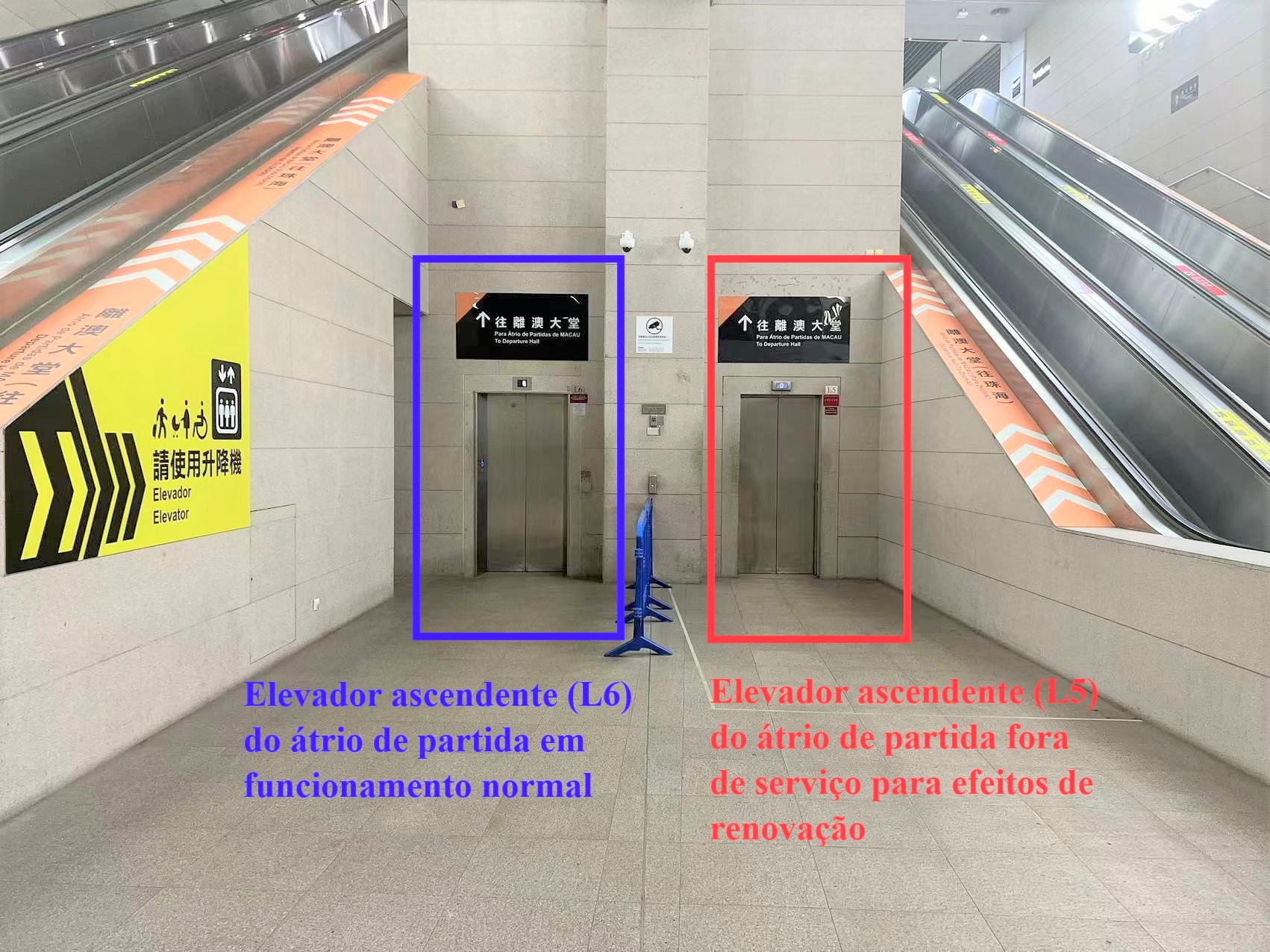 Os passageiros que saiam de Macau podem usar o elevador descendente L8, quando necessário