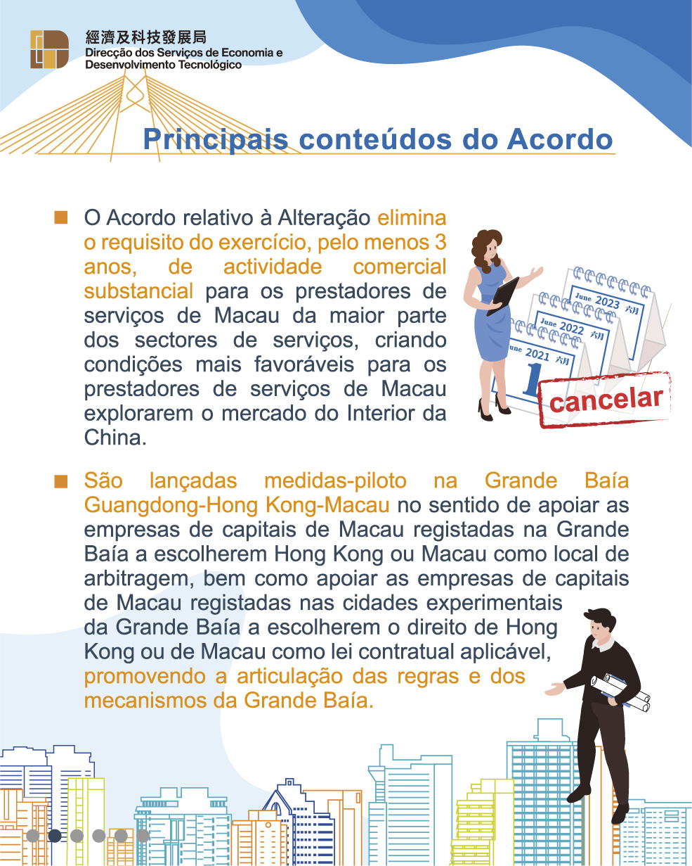 No Acordo relativo à Alteração II, são acrescentadas medidas de liberalização nos sectores de serviços de tecnologia de ponta, financeiros, audiovisuais e culturais, com vista a apoiar a estratégia de desenvolvimento da diversificação adequada da economia de Macau “1 + 4”, criando um novo espaço para o desenvolvimento da diversificação adequada da economia de Macau. No sector de tecnologia, as empresas de Macau certificadas no âmbito do “Programa de Certificação de Empresas de Tecnologia”, desde que reúnam os requisitos, são consideradas como as empresas de tecnologia de ponta no Interior da China em termos de recebimento do tratamento igual, execptuando os benefícios fiscais; é permitido aos prestadores de serviços de Macau que preencham os respectivos requisitos obterem no Interior da China as respectivas qualificações técnicas; é eliminado o limite da percentagem do capital social detida pelas empresas de Macau na prestação de serviços de centros de dados da Internet nas zonas piloto. No sector dos serviços financeiros, é eliminado o requisito do exercício, pelo menos 5 anos, de actividade comercial substancial para os bancos de Macau e é eliminada a restrição relativa ao activo total no fim do ano das instituições financeiras estrangeiras para a sua participação social em seguradoras, entre outros. Nos sectores audiovisuais e culturais, é permitido às empresas de Macau investirem na produção cinematográfica e as telenovelas co-produzidas com a parte do Interior da China podem ser consideradas como domesticamente produzidas para efeitos da sua emissão e distribuição, entre outros.