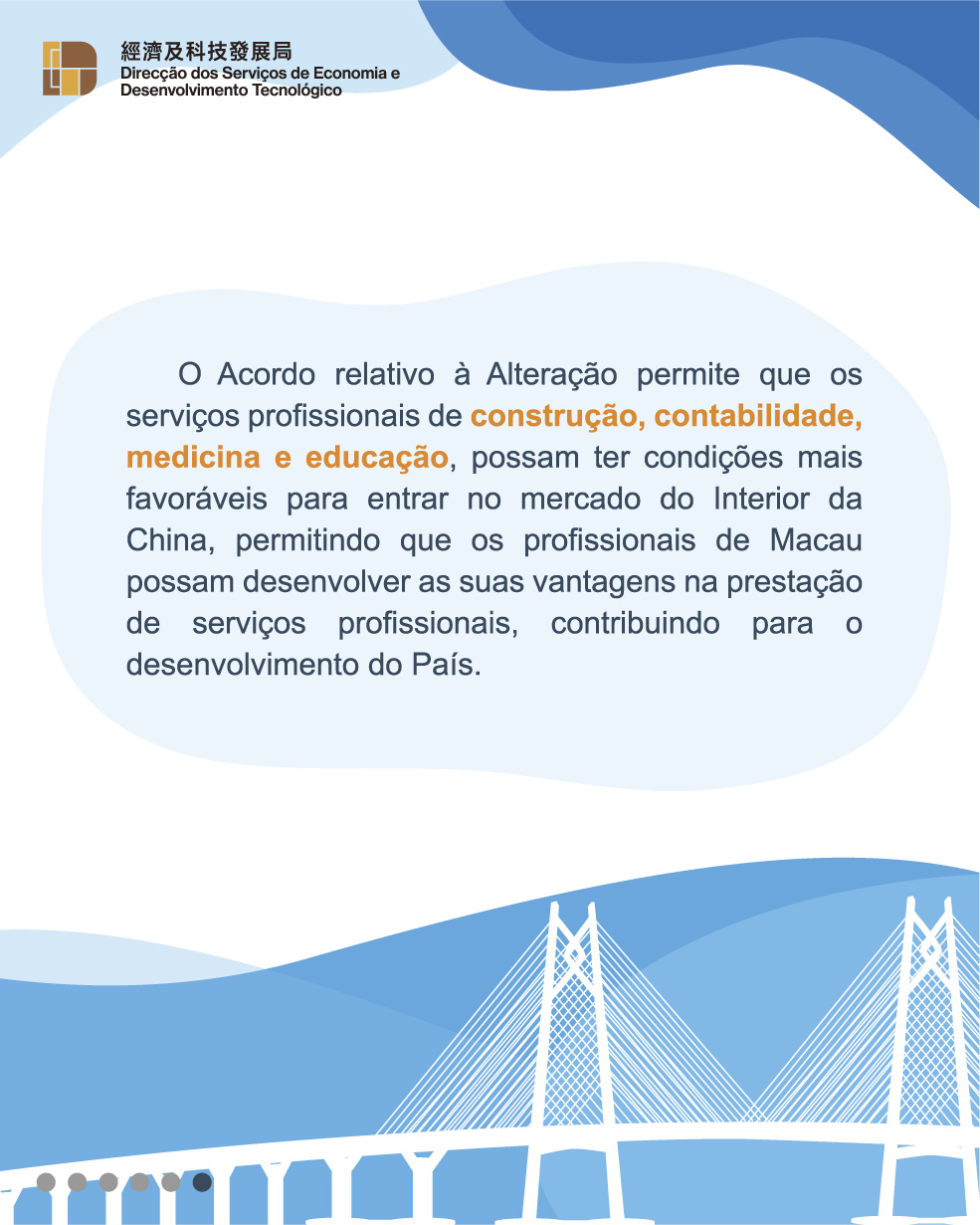 Além dos referidos, o Acordo relativo à Alteração II eleva ainda mais o nível de liberalização aos serviços profissionais de Macau, permitindo que os serviços profissionais de construção, contabilidade, medicina e educação, entre outros, possam ter condições mais favoráveis para entrar no mercado do Interior da China, permitindo que os prestadores de serviços de Macau possam desenvolver as suas vantagens, contribuindo para o desenvolvimento nacional.