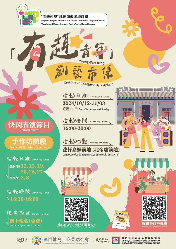A “Young-Teresting Creative and Cultural Marketplace” terá lugar entre 12 de Outubro e 3 de Novembro, todos os sábados e domingos, das 16h00 às 20h00, no Largo de Camões, na Taipa (Largo do Templo Pak Tai). O público poderá encontrar durante a feira, obras de arte e produtos culturais e criativos requintados, provar iguarias típicas de Macau e realizar várias oficinas de artesanato, que proporcionam aos residentes e visitantes uma experiência da vitalidade das zonas comunitárias de Macau.