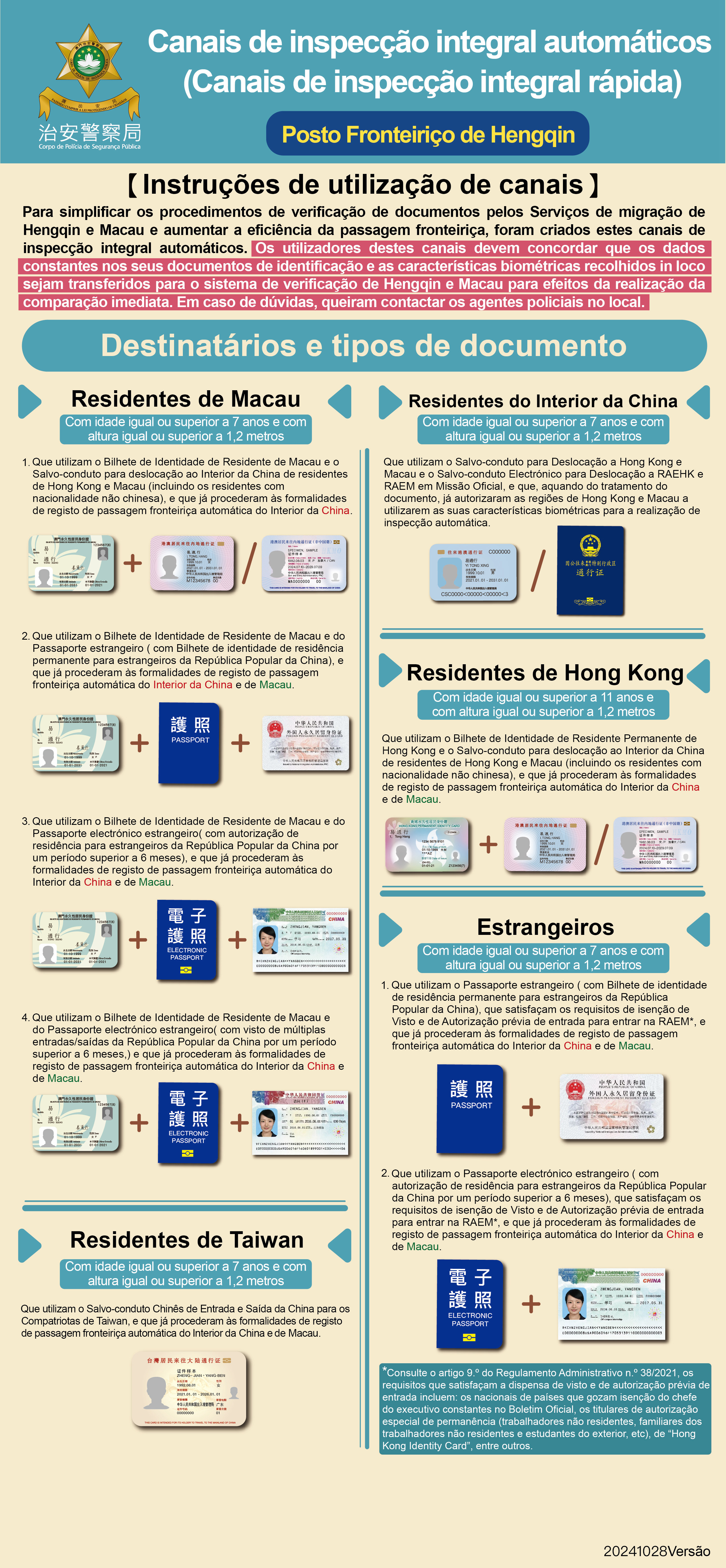 Com vista a apoiar o desenvolvimento da Zona de Cooperação Aprofundada entre Guangdong e Macau em Hengqin e facilitar ainda mais a circulação de pessoas entre Hengqin e Macau, após negociações entre o Corpo de Polícia de Segurança Pública (CPSP) e a Estação Geral de Inspecção Fronteiriça de Zhuhai, a partir de 28 de Outubro de 2024, foi alagardo no Posto Fronteiriço Hengqin o âmbito dos destinatários do “canal de inspecção integral automático”. Os portadores dos seguintes três tipos de passaporte estrangeiro podem usar o “canal de inspecção integral automático” deste posto fronteiriço depois de terem efectuado as formalidades de registo de dados para a passagem fronteiriça automática de Macau e do Interior da China: