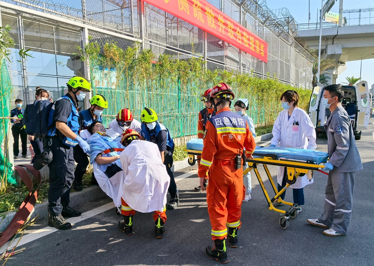 Depois de a brigada de socorro de incêndio de Hengqin ter chegado ao poço de evacuação do lado de Hengqin, demoliu as redes de vedação e prestou enfermagem pré-hospitalar e controlo de ordem no local da primeira fase aos feridos. Os veículos de socorro transfronteiriço e os agentes do CB de Macau chegaram posteriormente ao local, que simularam o transporte imediato dos dois feridos (o braço de um ferido ficou fracturado e um ferido sentiu-se mal disposto devido à inalação do fumo denso) para o hospital da parte de Macau para o tratamento e enviaram agentes para entrar na conduta do metro ligeiro incendiado para efectuar as tarefas de busca e salvamento, extinção do fogo e extracção de fumos. Devido que o estado do outro ferido desmaiado era urgente, foi levado para o hospital local para o tratamento pelos “Serviços de Saúde” da “Zona de Cooperação”, aqueles que não necessitaram de ser transportados para o hospital foram levados para a sala de inspecção de passageiros dos veículos do Posto Fronteiriço de Hengqin pelos departamentos correspondentes, os serviços do posto fronteiriço dos dois locais abriram via exclusiva para verificar os registos de entrada e saída e voltaram para Macau depois do tratamento das formalidades da passagem da fronteira.