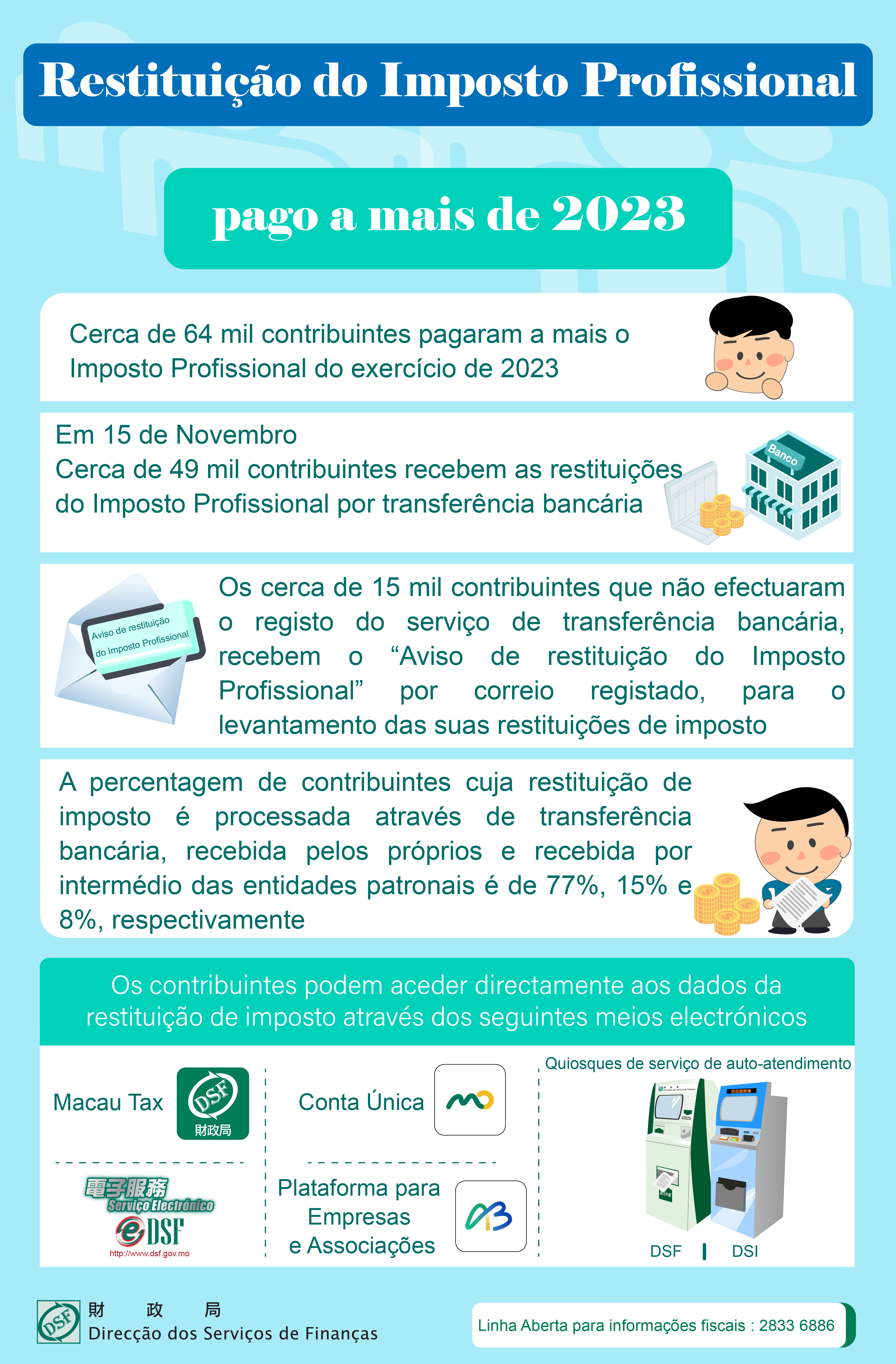 No que respeita aos cerca de 64 mil contribuintes que pagaram a mais o Imposto Profissional do exercício de 2023, a Direcção dos Serviços de Finanças já concluiu os procedimentos de restituição de imposto. Entre os quais, os 49 mil contribuintes que aderiram o serviço de transferência bancária para receber os pagamentos da DSF, têm as restituições depositadas nas suas contas bancárias no dia 15 de Novembro; os restantes 15 mil contribuintes que não efectuaram o registo do serviço de transferência bancária, recebem sucessivamente o “Aviso de restituição do Imposto Profissional” por correio registado, para o levantamento das suas restituições de imposto. A percentagem de contribuintes cuja restituição de imposto é processada através de transferência bancária, recebida pelos próprios e recebida por intermédio das entidades patronais é de 77%, 15% e 8%, respectivamente.