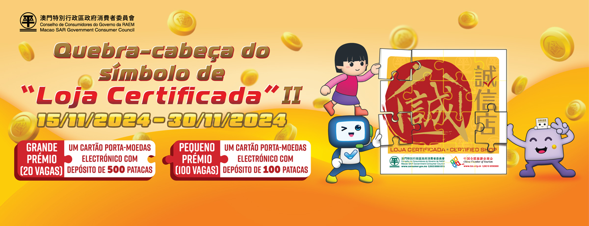 No sentido de aprofundar o conhecimento dos consumidores sobre o símbolo de qualidade de “Loja Certificada”, o Conselho de Consumidores (CC) promove vastamente a “Loja Certificada” mediante a organização contínua de diversas actividades, como a actividade “Quebra-cabeça do símbolo de Loja Certificada” (2.ª fase) que arranca hoje e decorre até 30 de Novembro, sendo bem-vinda a participação dos residentes.