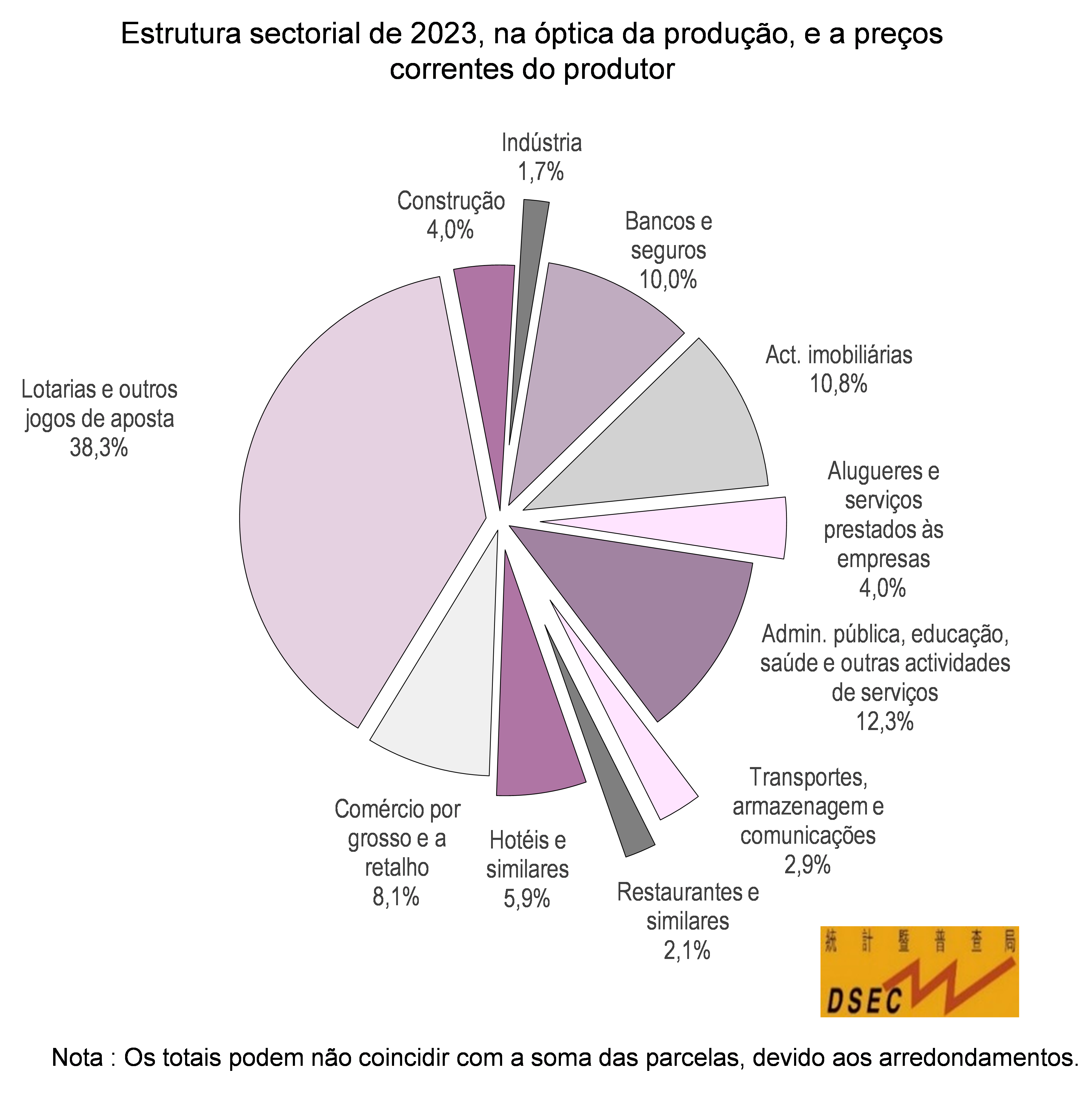 Em termos da estrutura sectorial, o peso do sector terciário aumentou 3,6 pontos percentuais em termos homólogos, para 94,4%, graças ao acentuado incremento do VAB deste sector, enquanto que o peso do sector secundário desceu 3,6 pontos percentuais, para 5,6%. Na perspectiva da estrutura dos ramos, o peso das “lotarias e outros jogos de aposta” (38,3%) voltou a subir 23,5 pontos percentuais, face a 2022, enquanto caía para 61,7% o peso dos ramos não jogo, apesar do aumento de 12,9 pontos percentuais em comparação com 2019. Em termos homólogos, no sector terciário, os “hotéis e similares” (5,9%) e os “restaurantes e similares” (2,1%) aumentaram os respectivos pesos em 3,5 e 0,4 pontos percentuais, porém, no sector secundário, a “construção” (4,0%), a “produção e distribuição de electricidade, gás e água” (0,9%) e as “indústrias transformadoras” (0,8%) registaram contracções nos respectivos pesos de 2,9; 0,5 e 0,1 pontos percentuais.