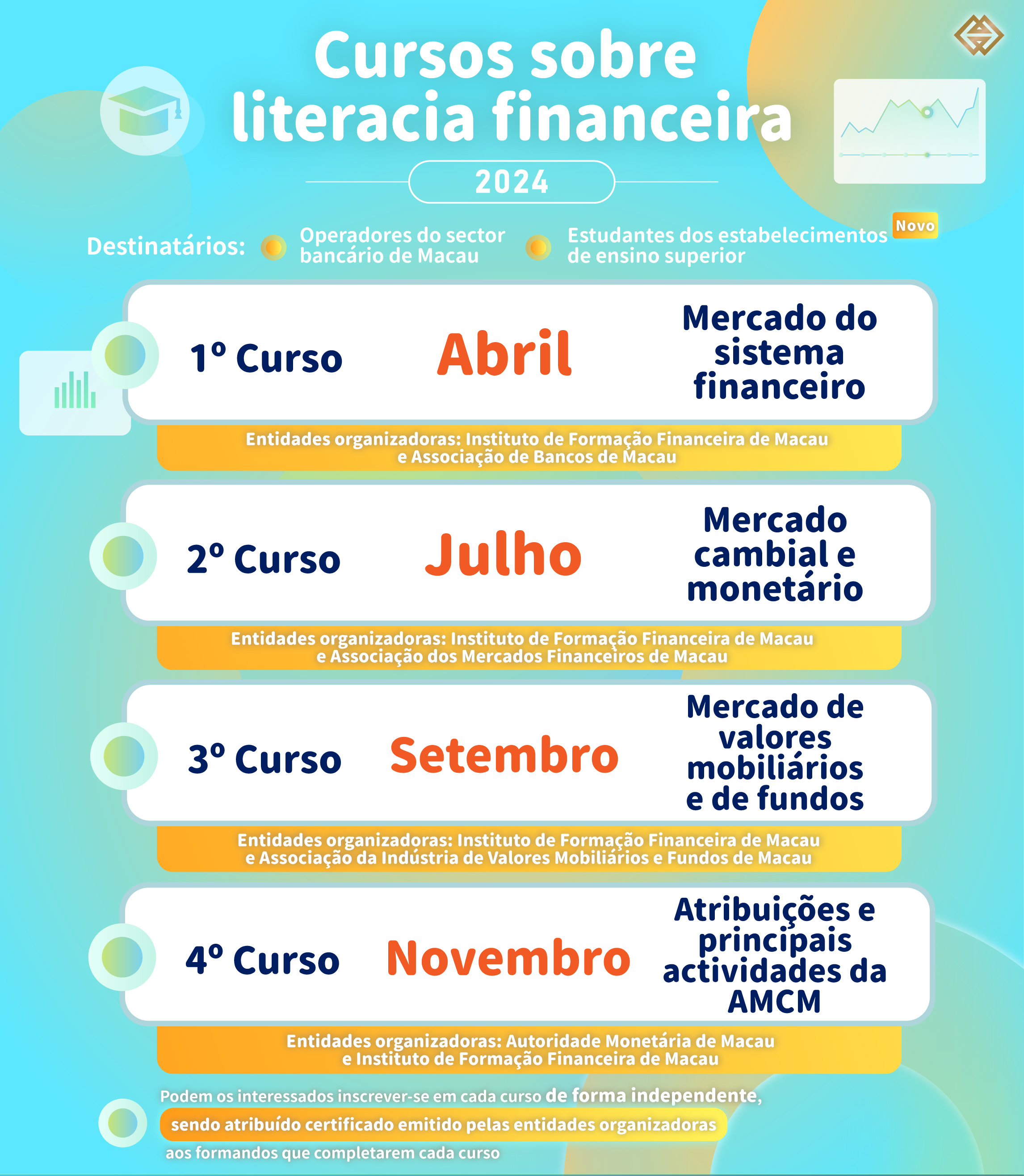 Os três primeiros cursos foram organizados pelo IFF, e tiveram lugar em Abril, Julho e Setembro, respectivamente, em conjunto com a Associação de Bancos de Macau, a Associação dos Mercados Financeiros de Macau e a Associação da Indústria de Valores Mobiliários e Fundos de Macau, tendo os programas dos cursos consistido em: sistema e mercado financeiro, mercados cambiais e monetários, bem como mercados de valores mobiliários e fundos, pelo que foram convidados profissionais do sector com vasta experiência profissional como formadores para apresentar, de forma simples, os conceitos fundamentais sobre as práticas financeiras. Por outro lado, o quarto curso foi organizado em Novembro, pela AMCM em conjunto com o IFF, constando do mesmo as principais atribuições da AMCM, na qualidade de banco central da RAEM, proporcionando assim aos participantes uma compreensão aprofundada do sistema de supervisão financeira e dos requisitos regulamentares de Macau, bem como da tendência de desenvolvimento da indústria financeira moderna em Macau.