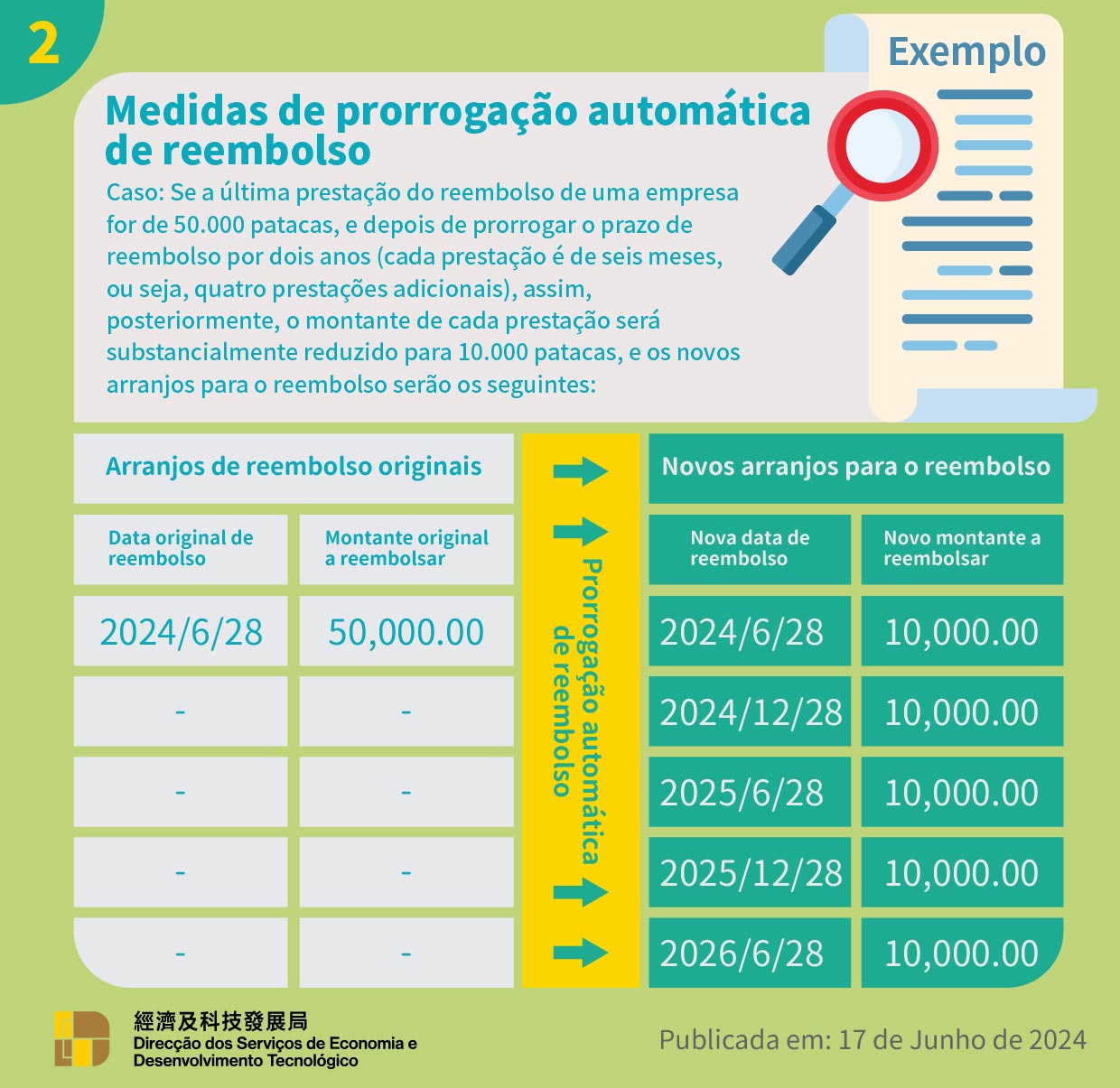 Com vista a aliviar a pressão do reembolso dos empréstimos por parte das PME, o Governo da RAEM, através do Regulamento Administrativo n.º 22/2024, prorroga o prazo máximo de reembolso dos empréstimos concedidos nos termos dos planos acima referidos, de oito para dez anos, com efeitos a partir de 18 de Junho de 2024. A DSEDT informará, de forma ordenada e por grupos, as empresas beneficiárias, através de mensagem de telemóvel e ofício, sobre o ajustamento do prazo de reembolso, sem necessidade de apresentação do pedido, a fim de atingir o objectivo de facilitar a vida da população e dos empresários.